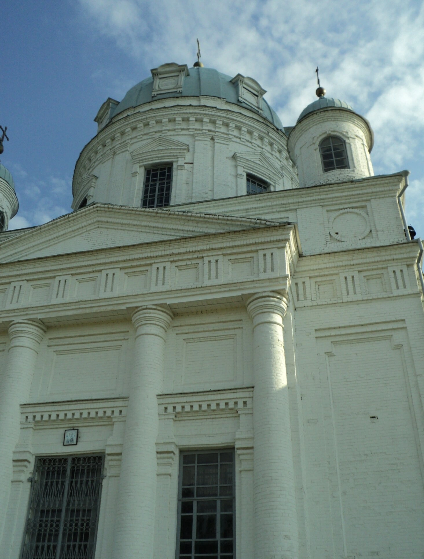 На фасаде здания чётко просматриваются высокие прямоугольные окна, некоторые из которых защищены коваными решётками. Небесная лазурь с плывущими облаками служит величественным фоном, подчёркивая устремлённость храма ввысь, к горним высотам. Данное изображение не только передаёт внешнюю красоту святого места, но и позволяет ощутить его глубокую молитвенную атмосферу, призывая к размышлению о вечном.