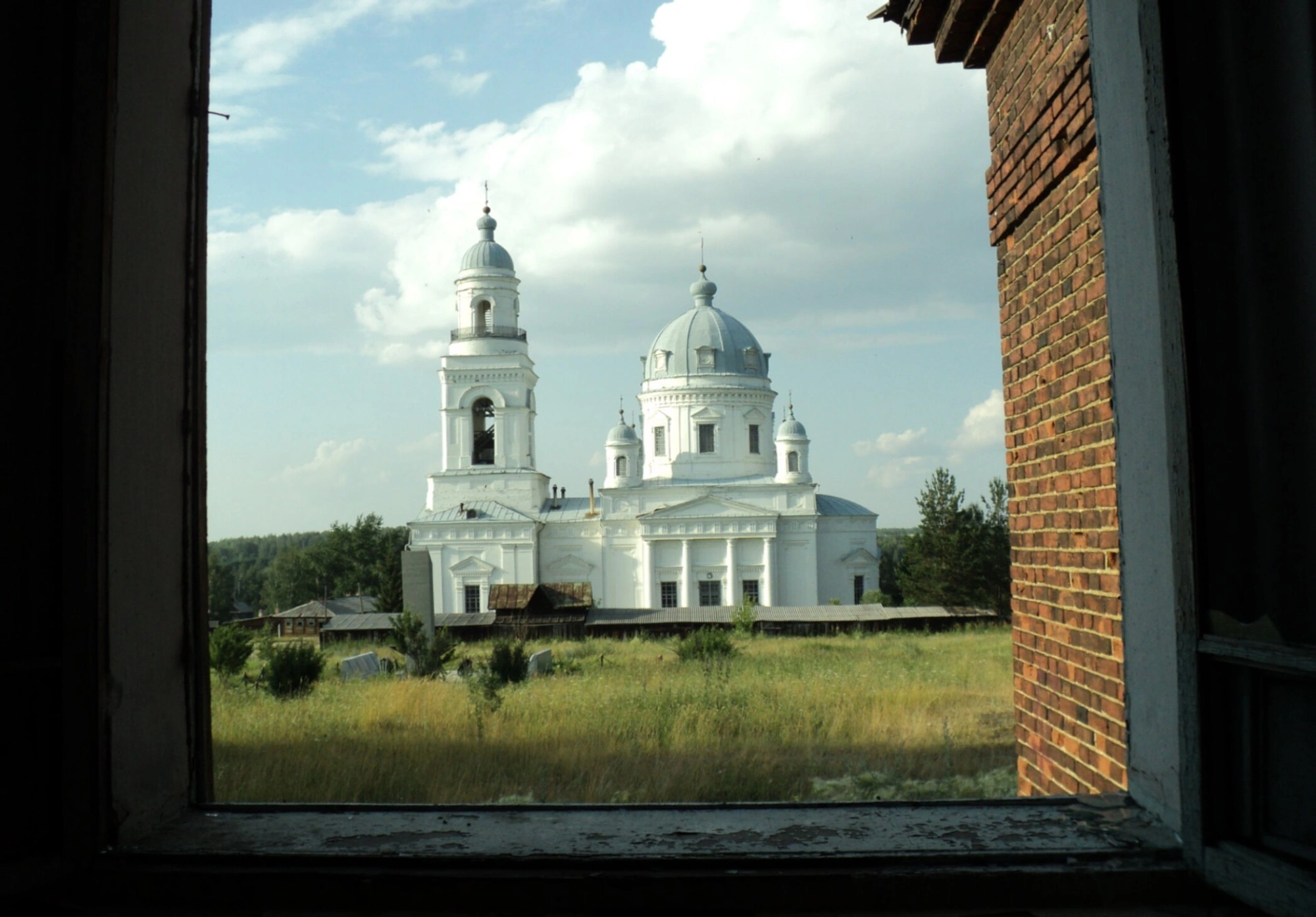 Особую художественную ценность снимку придаёт то, что он сделан через арочный оконный проём старинного каменного здания, который образует естественную рамку, обрамляющую храм. Этот приём символически отделяет мирскую суету от духовного благолепия дома Божиего. Фотография передаёт умиротворённую атмосферу этого святого места, где молитва и благодать соединяются с красотой уральской природы.