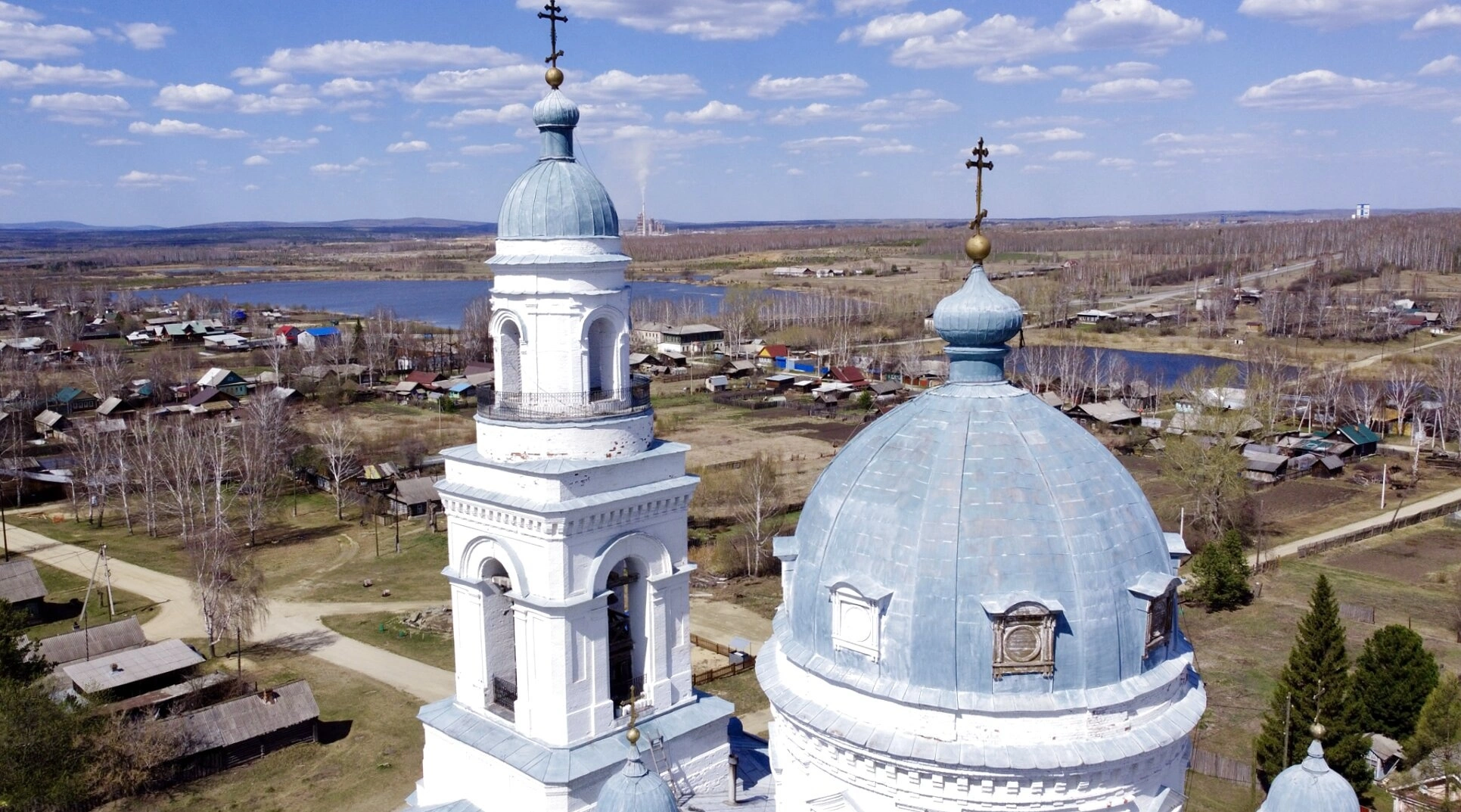 На заднем плане открывается вид на благостный сельский пейзаж: традиционные дома, утопающие в зелени деревьев, и водную гладь местных водоёмов, придающих особую умиротворённость святому месту. Лазурное небо с легкими облаками осеняет храм и всю округу, создавая ощущение благодати и покоя, свойственного русской глубинке.