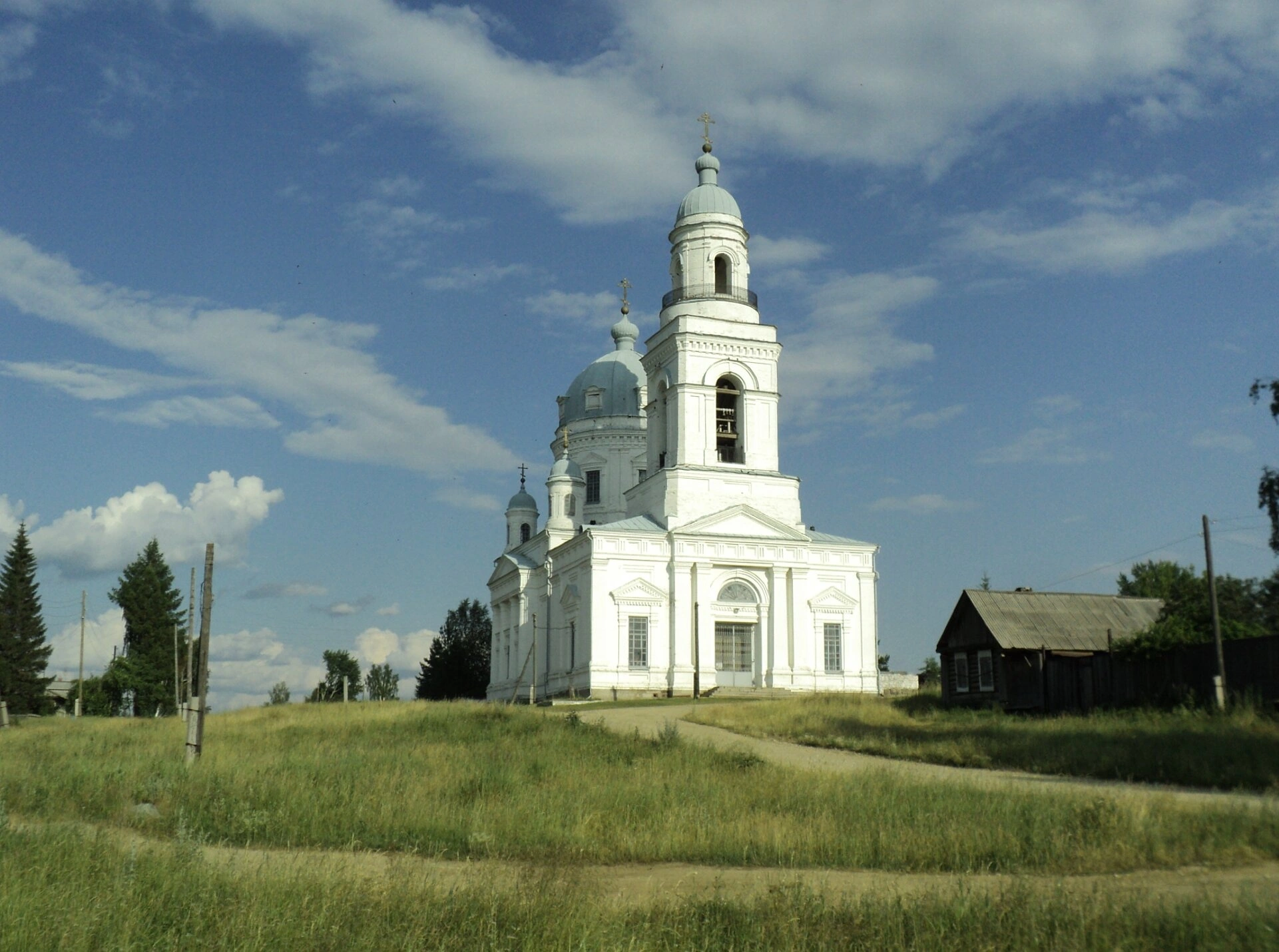 Храм окружает просторное травянистое поле, а на заднем плане виднеется лесной массив, что подчеркивает уединенный и благодатный характер этого святого места. Справа от церкви располагается небольшое деревянное строение, вероятно, используемое для хозяйственных нужд прихода. Небесная синева с легкими облаками и солнечное освещение придают снимку особую светлость и чистоту, создавая ощущение божественной благодати.