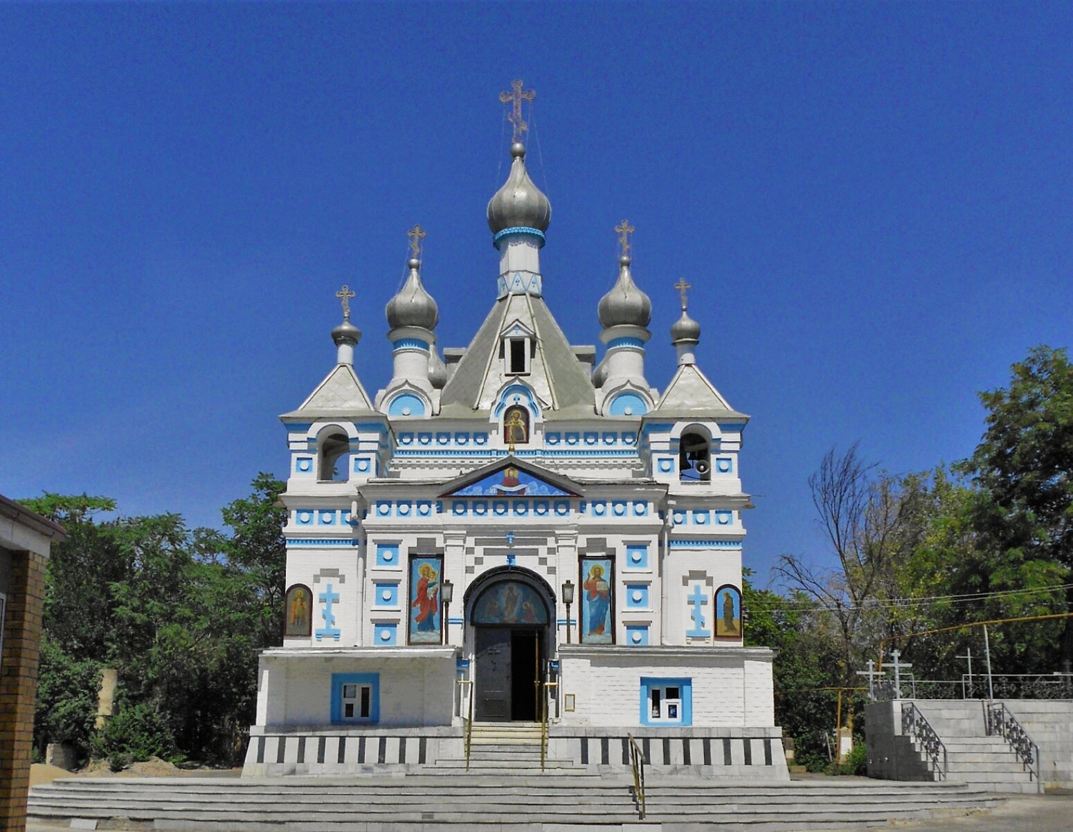 На представленной фотографии запечатлён православный храм в честь святого благоверного великого князя Александра Невского, расположенный на территории Боткинского кладбища в Ташкенте. Святыня является одним из старейших действующих православных храмов Узбекистана и важным духовным центром для верующих.