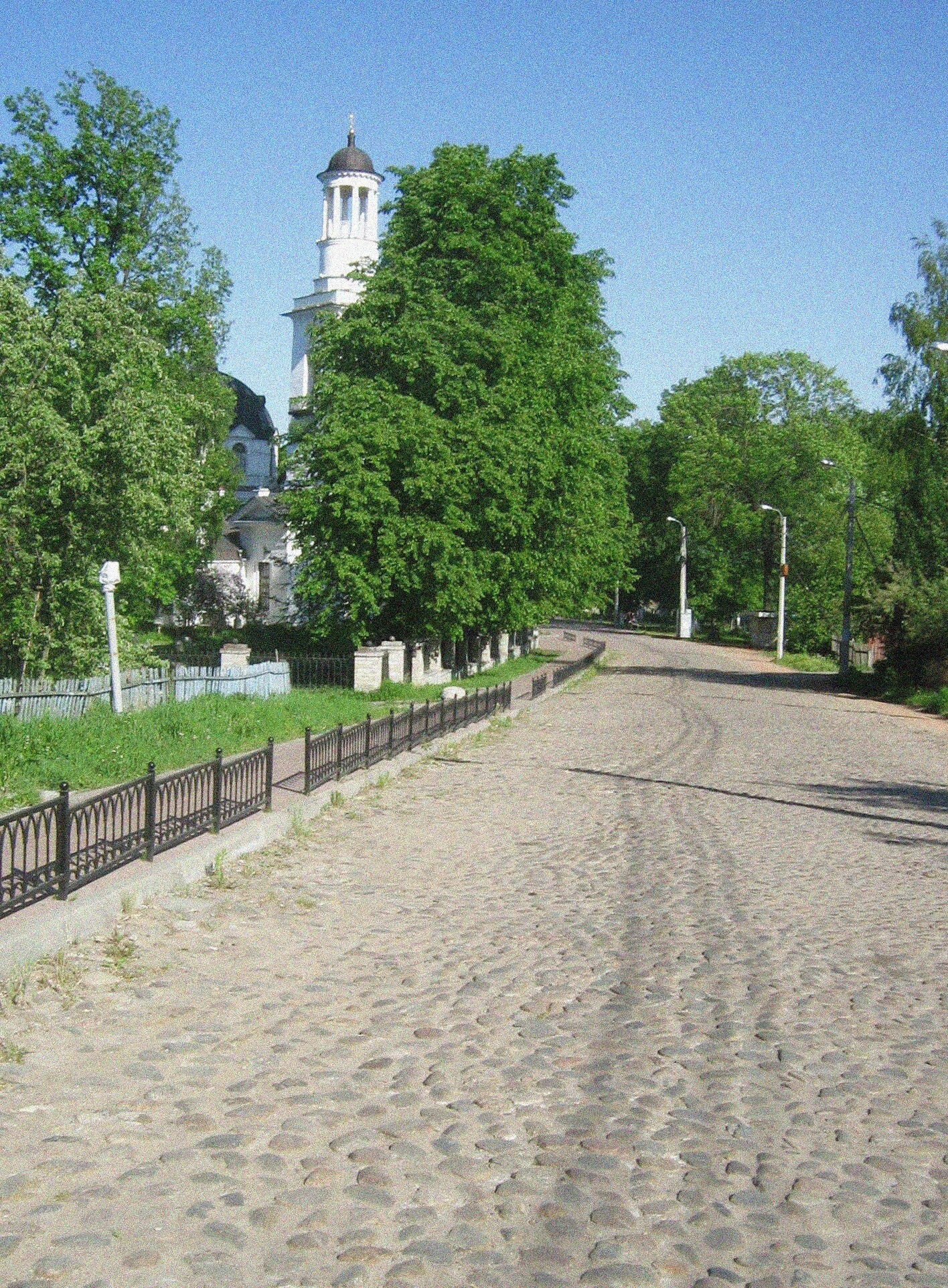 Белоснежная колокольня храма, увенчанная золочёной главкой с крестом, величественно возвышается над окружающим пейзажем, символизируя торжество Православия на русской земле. Архитектурный облик церкви, выполненный в традициях русского зодчества, гармонично вписывается в природное окружение из вековых деревьев и зелёных насаждений.