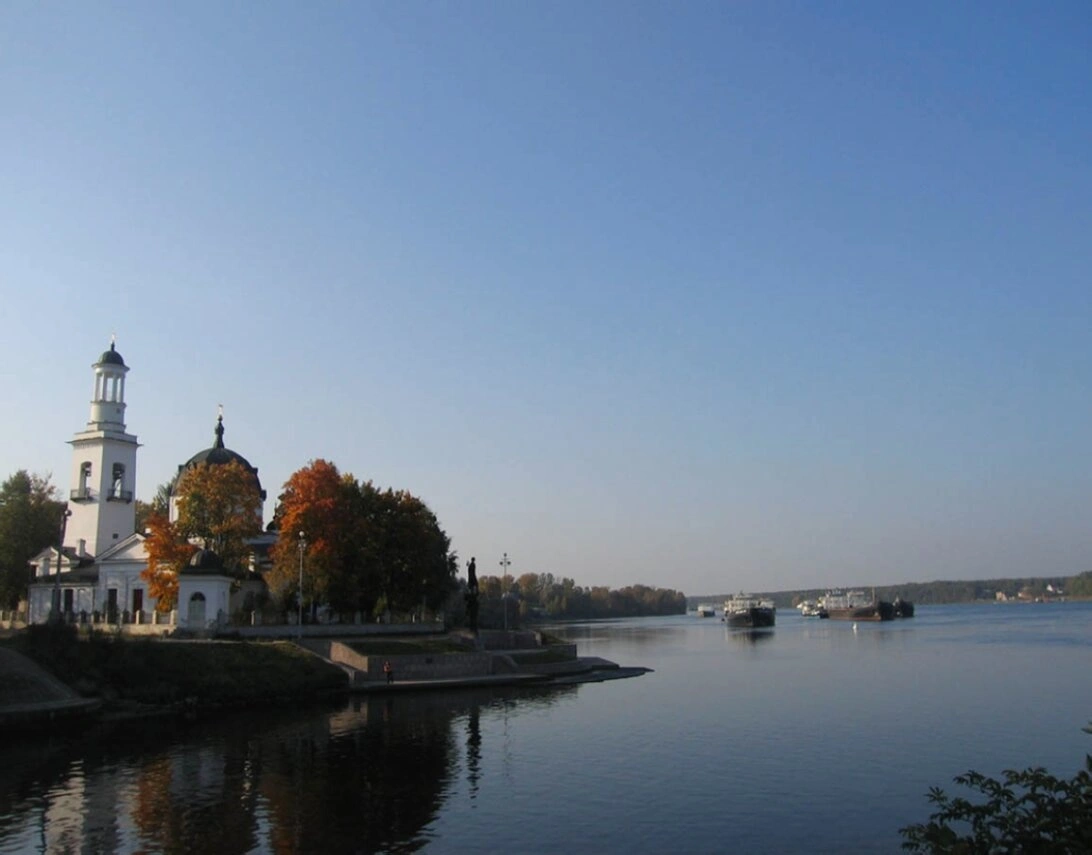 Широкая гладь реки Невы, занимающая центральную часть фотографии, отражает осеннее небо. На водной поверхности виднеется несколько судов, подчёркивающих оживлённость этой важной водной артерии. Пожелтевшая листва деревьев обрамляет святыню, создавая умиротворённый осенний пейзаж.