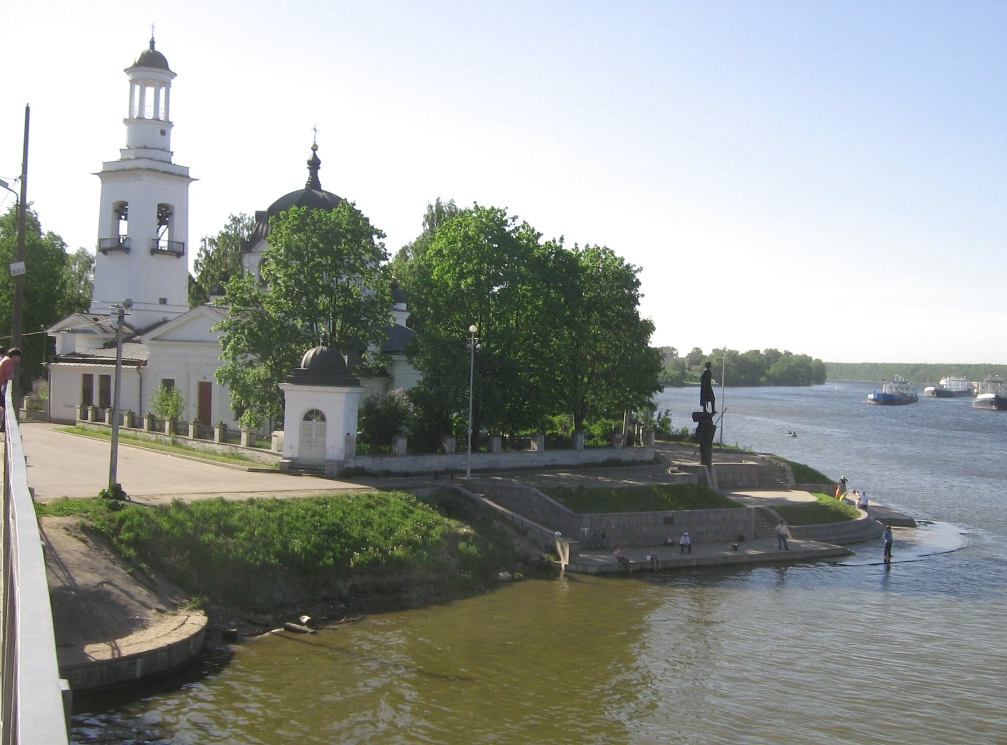С возвышенности, на которой расположена церковь, открывается прекрасный вид на широкую Неву, по которой и в наши дни, как и века назад, движутся суда. Благоустроенная набережная с лестницей, спускающейся к воде, и люди на берегу подчёркивают значимость этого места для паломников и туристов. Фотография сделана в ясный солнечный день, что позволяет в полной мере оценить величие архитектуры и живописность окружающего пейзажа, где история и современность существуют в неразрывном единстве.