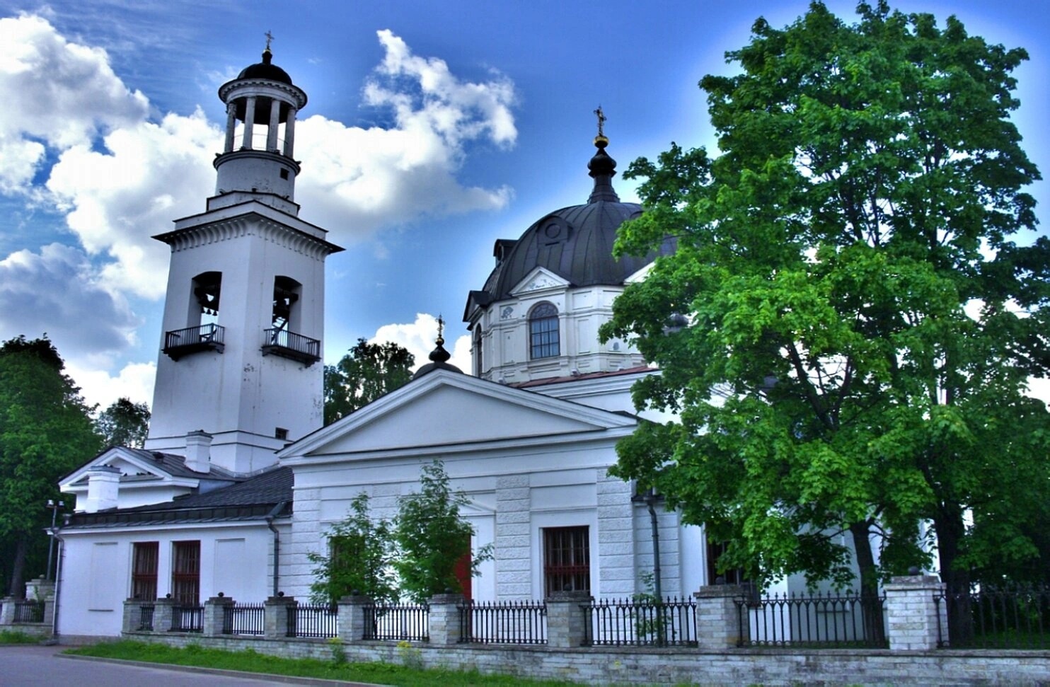На фотографии запечатлена церковь Святого Благоверного князя Александра Невского, расположенная в историческом поселке Усть-Ижора. Этот православный храм был возведен на легендарном месте, где в 1240 году дружина под предводительством князя Александра Ярославича одержала знаменательную победу над шведами, за что князь и был наречен Невским.