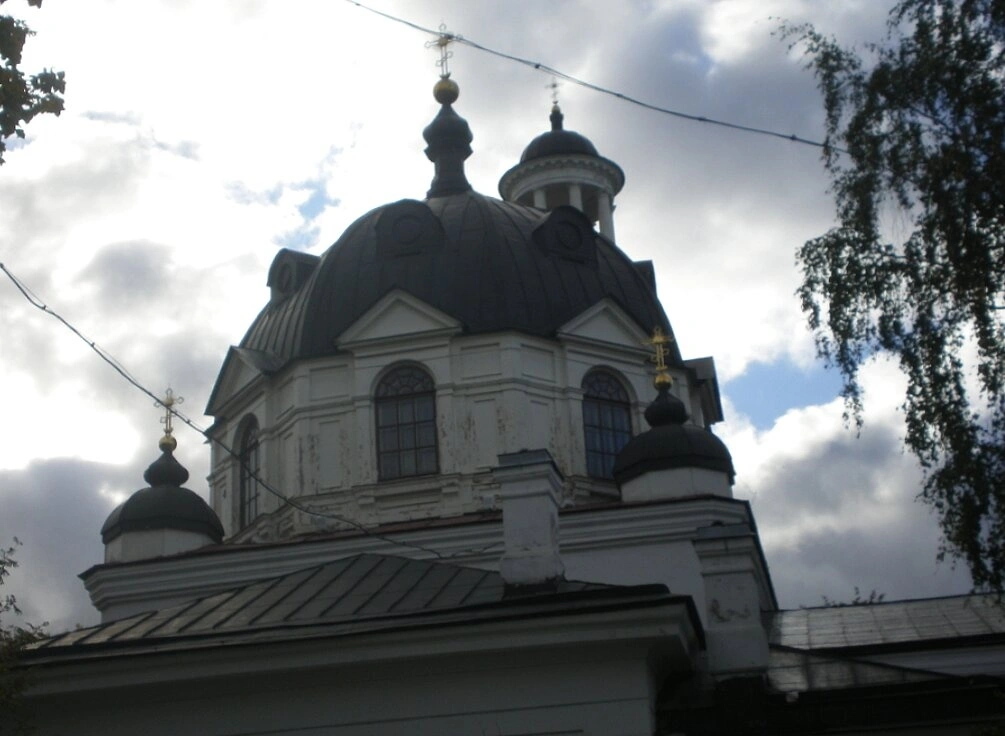 Архитектурный облик храма, доминирующий на снимке, представляет собой прекрасный образец русской церковной традиции. Взгляд приковывают устремлённые в небо золочёные кресты, венчающие тёмные купола-луковки, которые эффектно контрастируют со светлыми стенами. Арочные окна и изящные декоративные элементы фасада подчёркивают благолепие святыни.
