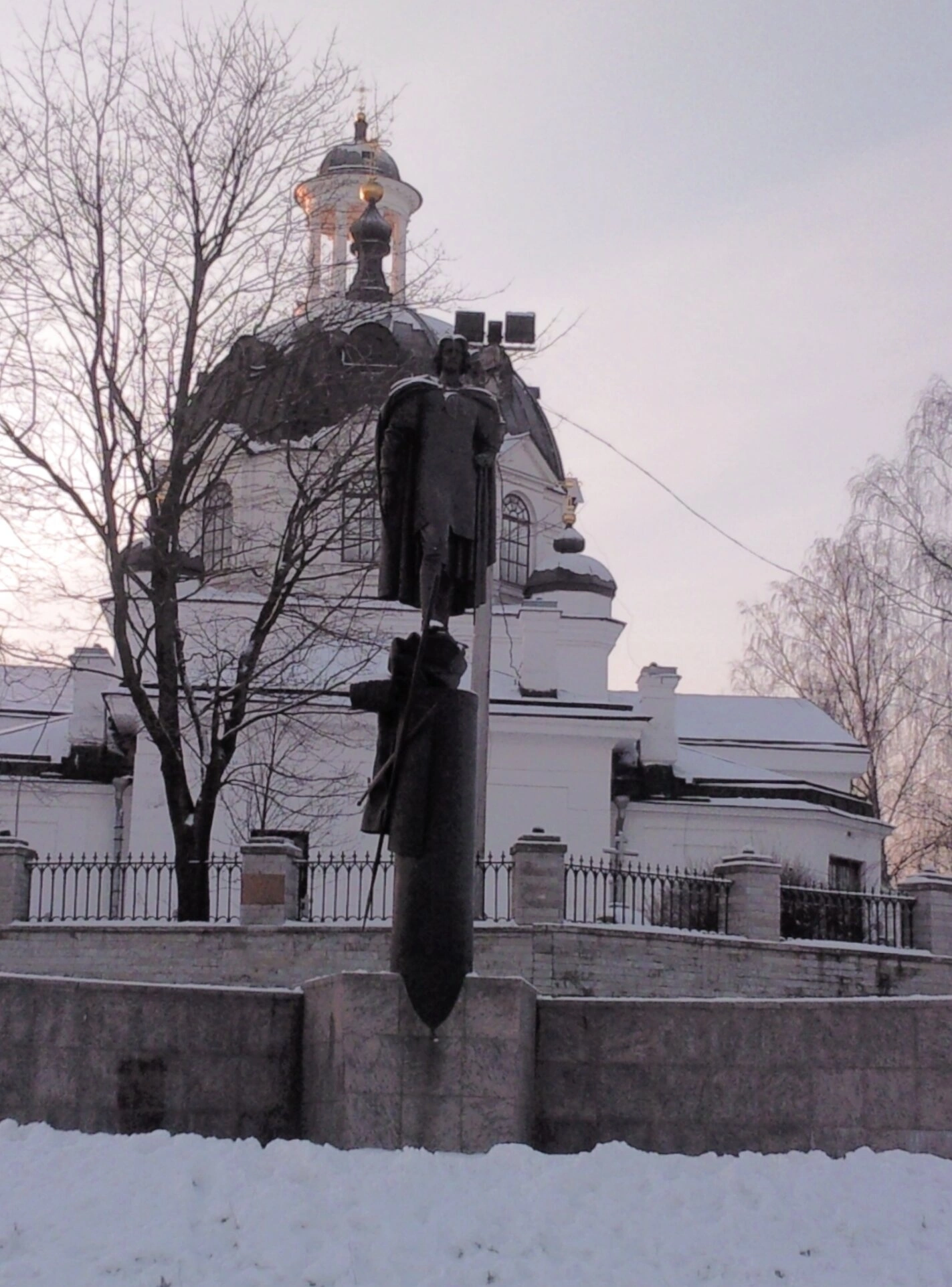 На фотографии запечатлен значительный для русской истории и православной веры ансамбль в поселке Усть-Ижора. На переднем плане возвышается величественный бронзовый памятник святому благоверному князю Александру Невскому, установленный в 2003 году на месте его исторической победы. Скульптор В. Э. Горевой и архитектор В. В. Попов изобразили князя в полный рост, стоящим на поверженных вражеских знаменах, что символизирует триумф православного воинства. Общая высота монумента составляет девять метров.