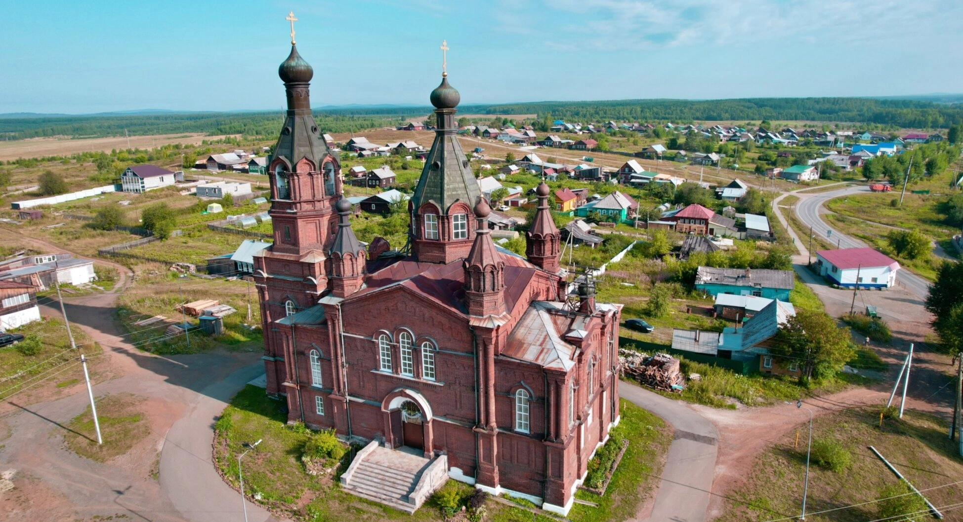 Снимок передаёт не только архитектурные детали храма – кокошники, арочные окна, кирпичный декор, – но и его гармоничное единство с окружающим пространством. Здание окружено частными домами и зеленью, что подчёркивает его неразрывную связь с жизнью города и его жителей. Фотография позволяет ощутить атмосферу благодати и покоя, которая присуща этому священному месту.
