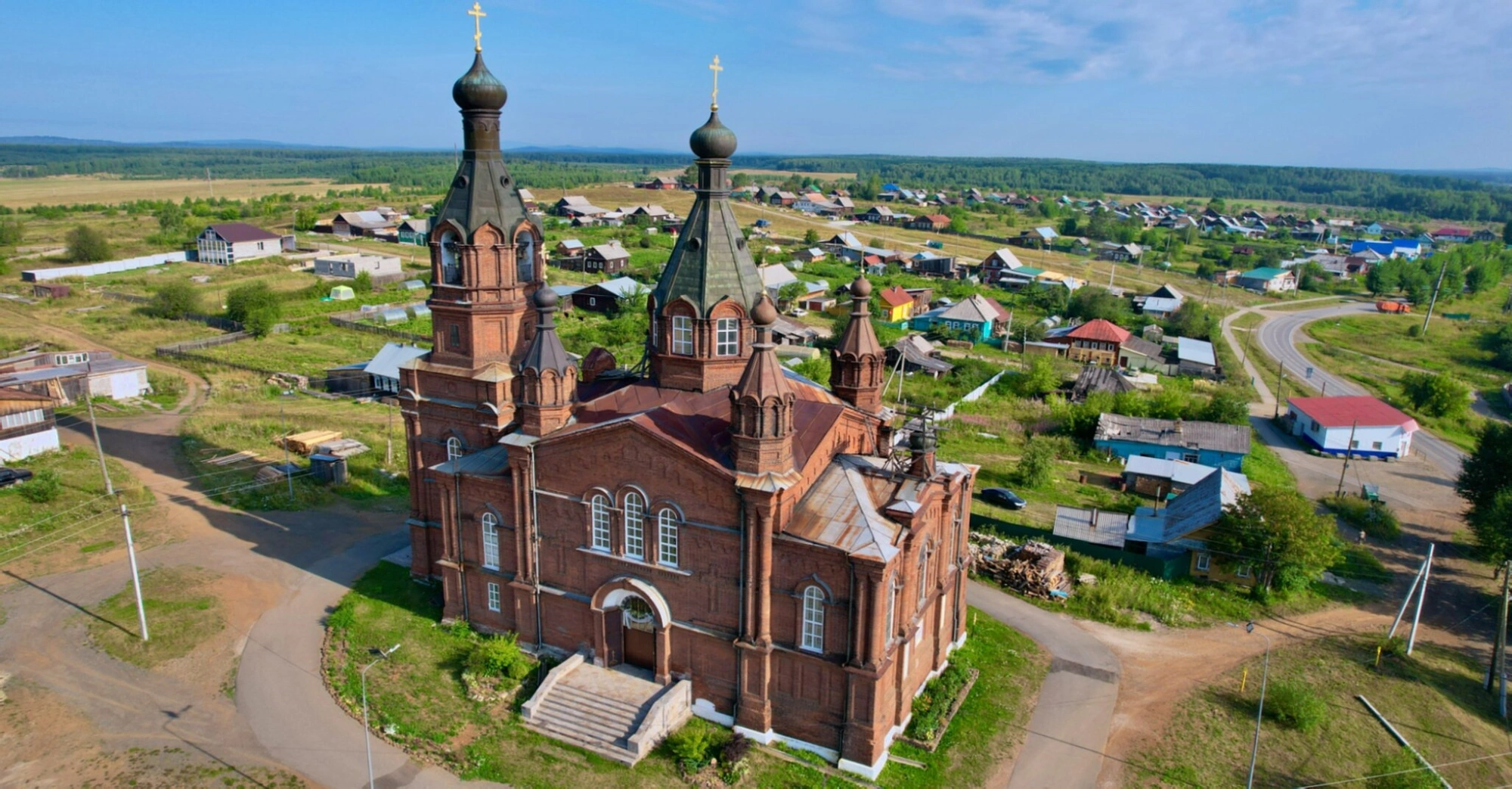 К храму ведёт благоустроенная дорога, образующая кольцевое движение, что обеспечивает удобный доступ для паломников и прихожан. Церковь окружена частными жилыми домами с ухоженными приусадебными участками, что создаёт атмосферу уюта и гармонии между духовной и мирской жизнью. На заднем плане открывается вид на живописные лесные массивы и бескрайние поля, характерные для уральского пейзажа, подчёркивая единение творения Божия.
