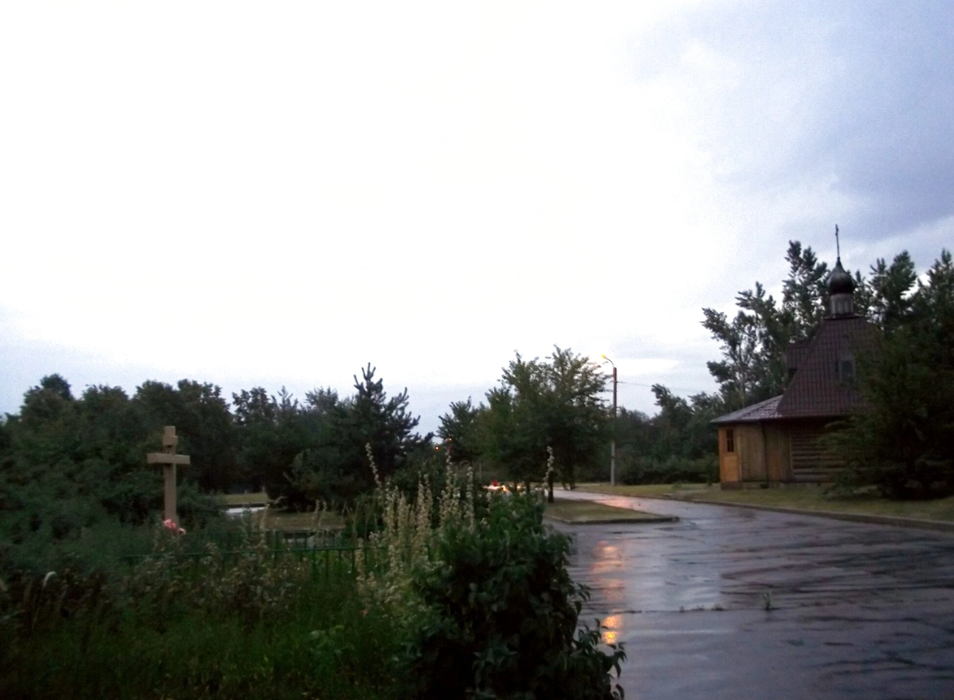 В правой части композиции возвышается деревянный храм, увенчанный лаконичным куполом-луковкой и православным крестом, сияющим в мягком свете. Строгая и в то же время изящная архитектура церкви характерна для традиционного русского зодчества. Храм был возведён в 2013 году и освящён в честь великого князя, одержавшего победу в Куликовской битве и почитаемого в лике святых.