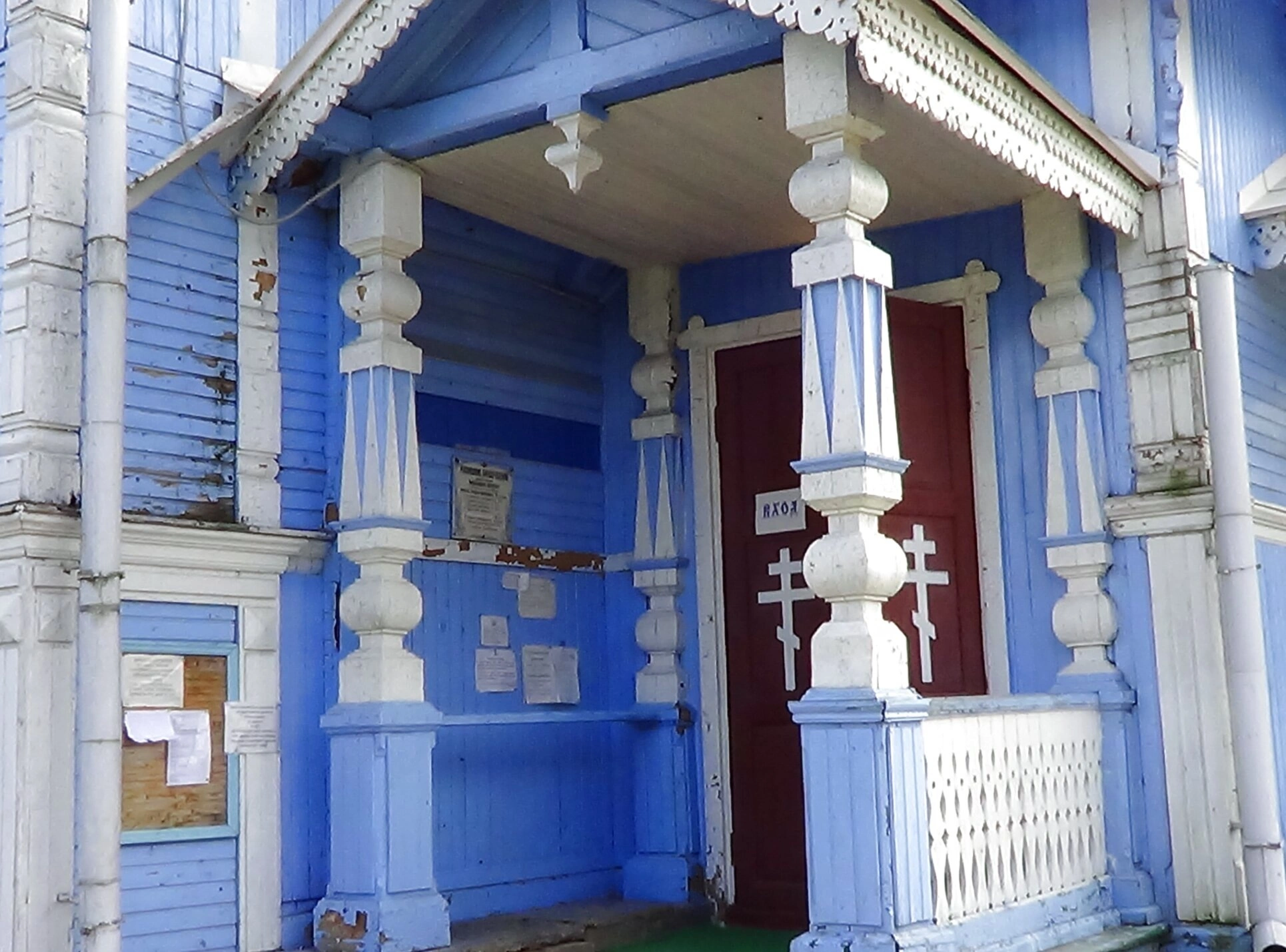 Яркий синий цвет стен символизирует небесную чистоту и Богородичную тематику в православной традиции, а белоснежные декоративные элементы и резные наличники подчёркивают благолепие дома Божия. Входная группа состоит из резного портала с колоннами и балюстрадой, над которым расположен защитный козырёк с ажурной резьбой. Дверь красного цвета, традиционного для многих православных храмов, украшена священными изображениями крестов и четко обозначена надписью «ВХОД», что приглашает верующих переступить порог молитвенного помещения.