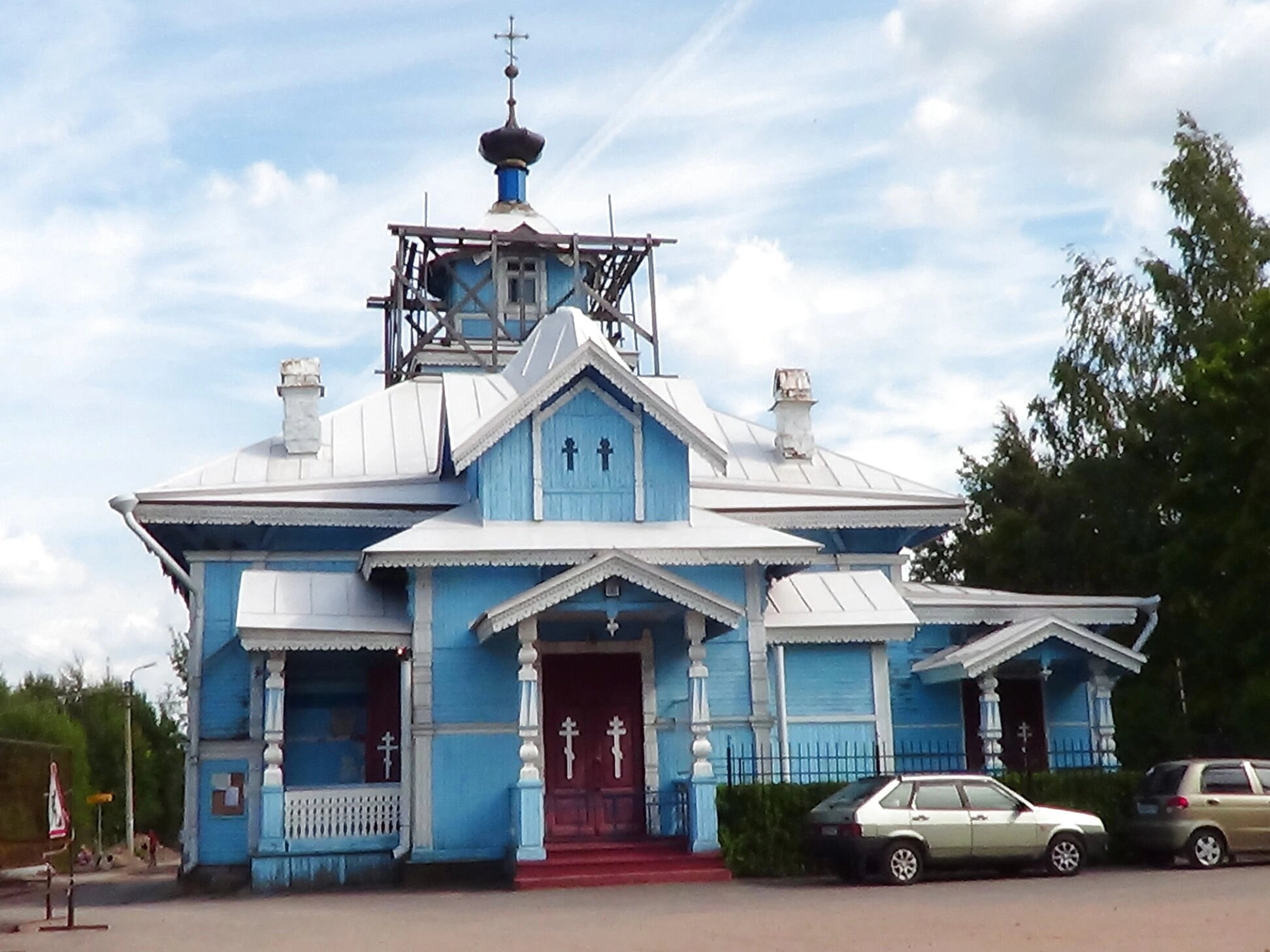 На фотографии запечатлён храм в честь святого благоверного великого князя Александра Невского, расположенный в историческом районе Санкт-Петербурга — Красном Селе. Святыня является значимым духовным центром и памятником деревянной церковной архитектуры.