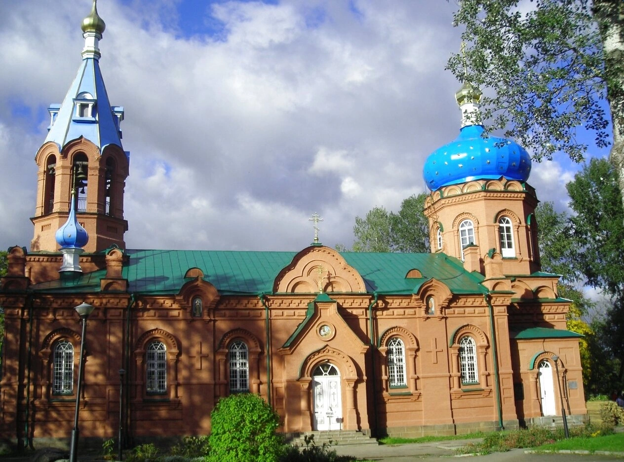 На фотографии запечатлён Воинский храм во имя Святого Благоверного Великого Князя Александра Невского, расположенный в древнем Пскове на улице Мирной. Этот величественный каменный храм был возведён в 1908 году для 96-го Омского полка, расквартированного в городе, и освящён в честь небесного покровителя воинства. Архитектура церкви решена в русском стиле, характерном для начала XX века, с шатровой колокольней, луковичными главками и килевидными закомарами, что придаёт ей узнаваемый и благолепный вид.