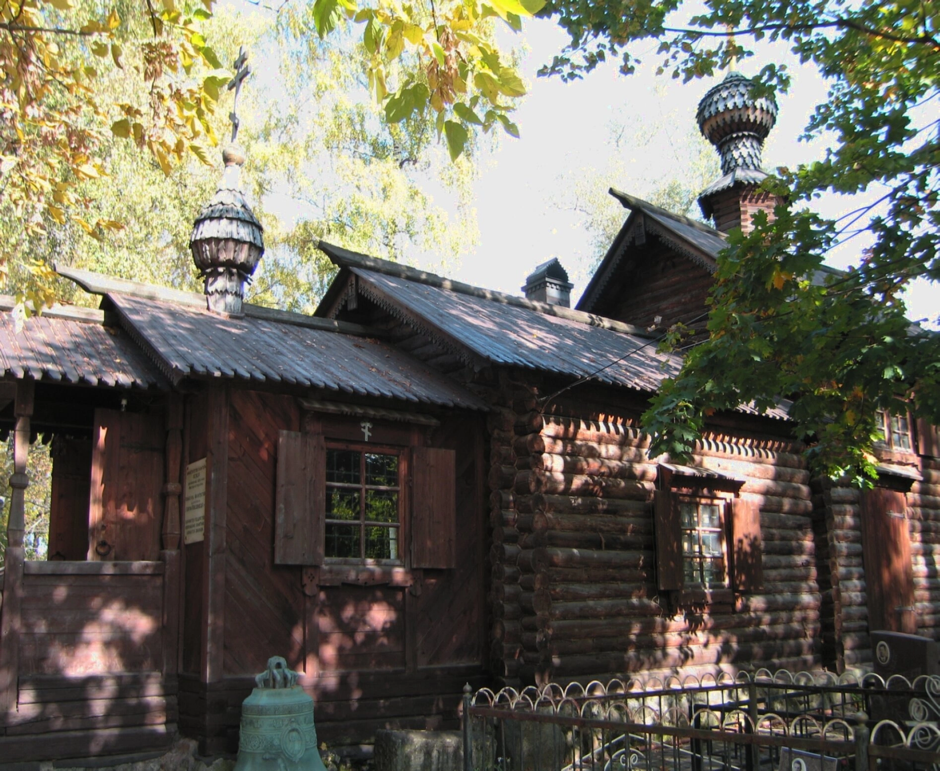 На представленной фотографии запечатлена деревянная Церковь великомученика Георгия Победоносца, расположенная в подмосковном городе Долгопрудный. Этот православный храм возведён в лучших традициях русского деревянного зодчества и представляет собой значимый духовный центр для верующих.