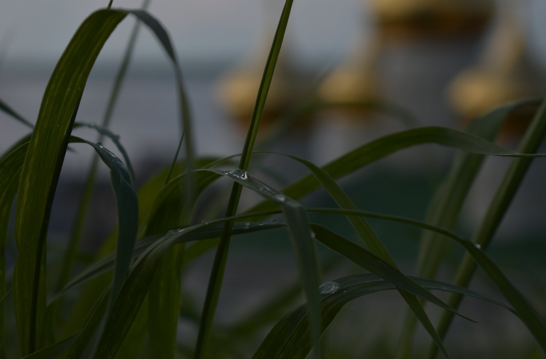 На представленной фотографии запечатлён уникальный ракурс одного из самых значимых православных храмов Нижнего Новгорода — собора в честь Святого Пророка, Предтечи и Крестителя Господня Иоанна. На переднем плане, символизируя чистоту и благодать, изображена свежая зелёная трава с каплями утренней росы, переливающимися в лучах восходящего солнца. Этот природный элемент композиции создаёт ощущение свежести и обновления, напоминая о духовном очищении.