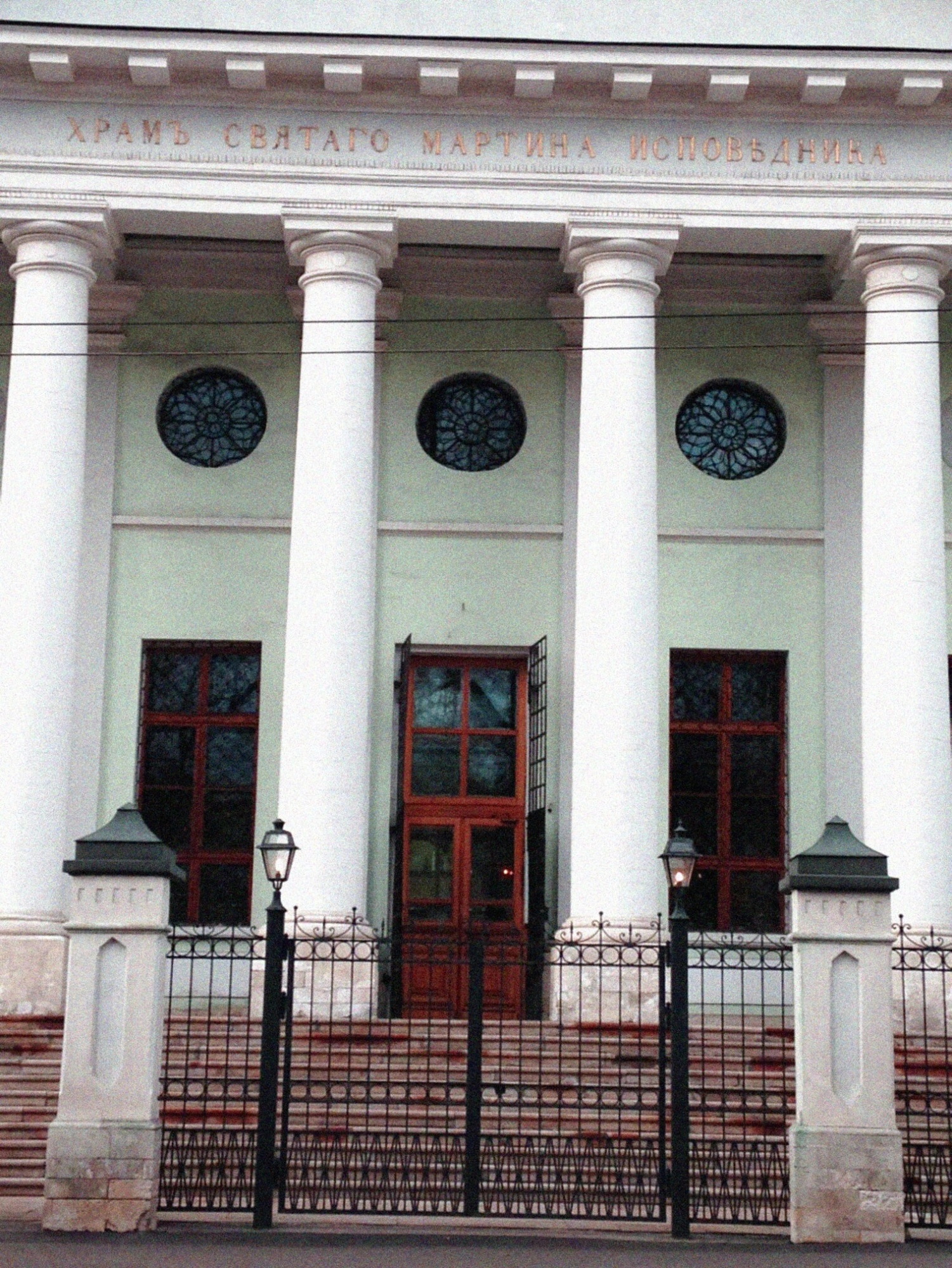 На представленной фотографии запечатлён величественный фасад храма во имя святого Мартина Исповедника, Папы Римского, что расположен в Москве, в исторической местности, известной как Алексеевская Новая Слобода. Святыня, освящённая в честь угодника Божия, пострадавшего за исповедание православной веры в VII веке, является выдающимся памятником церковной архитектуры эпохи классицизма.
