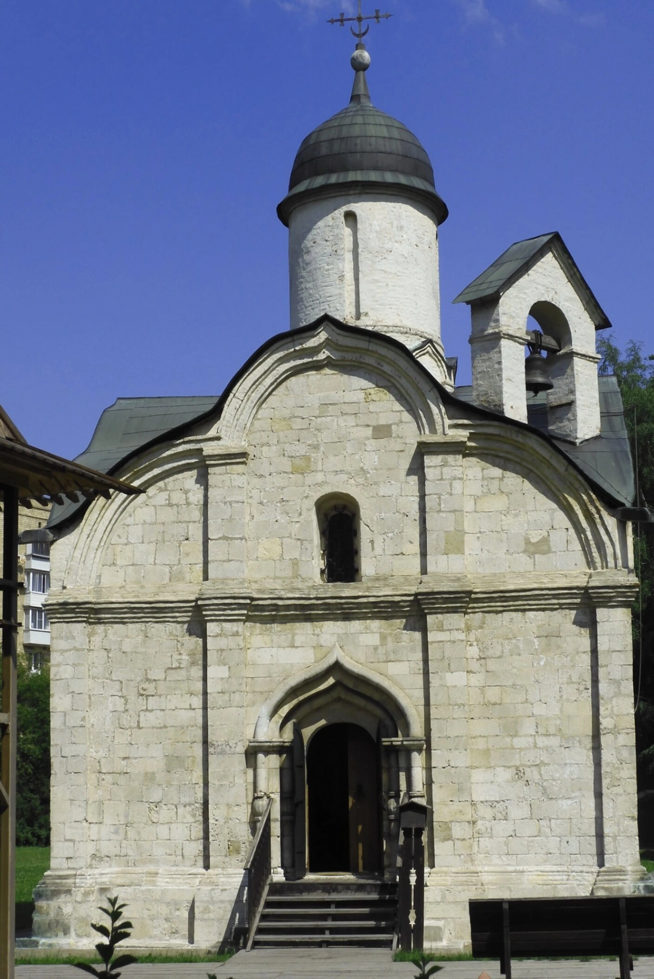 На фотографии запечатлён вид на старинный православный храм во имя святого мученика Трифона в Напрудном. Этот уникальный памятник древнерусского зодчества, расположенный в районе Марьина Роща недалеко от Рижского вокзала, является одним из древнейших сохранившихся храмов Москвы.