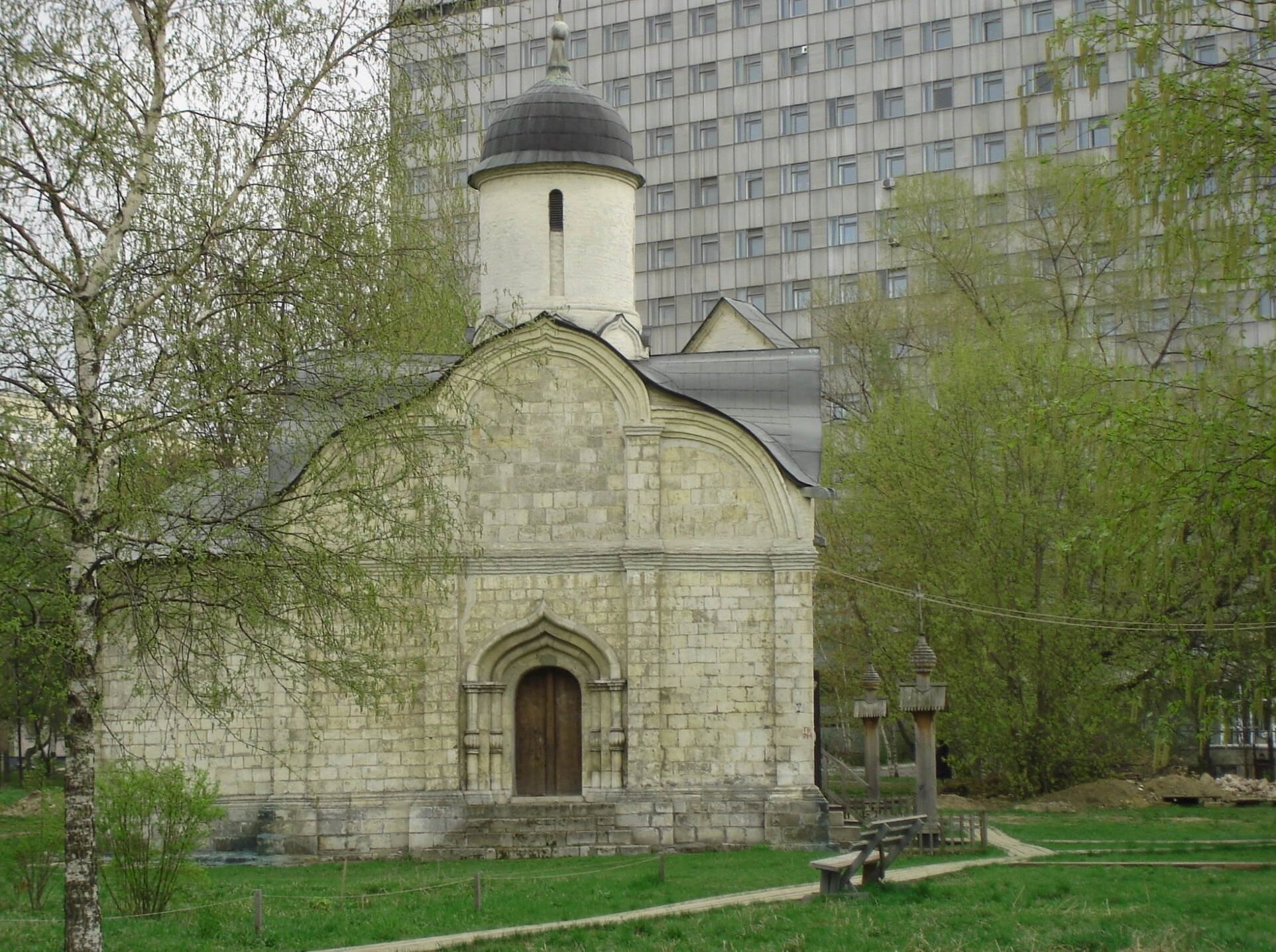 На переднем плане видна хорошо утоптанная тропинка, ведущая к входу в храм, что свидетельствует о регулярном посещении его верующими. Территория вокруг церкви благоустроена, здесь можно заметить скамью для отдыха паломников. Историческую ценность и древность храма подчёркивает контраст с современным многоэтажным зданием, виднеющимся на заднем плане, который символизирует непрерывность духовной жизни Москвы сквозь века.