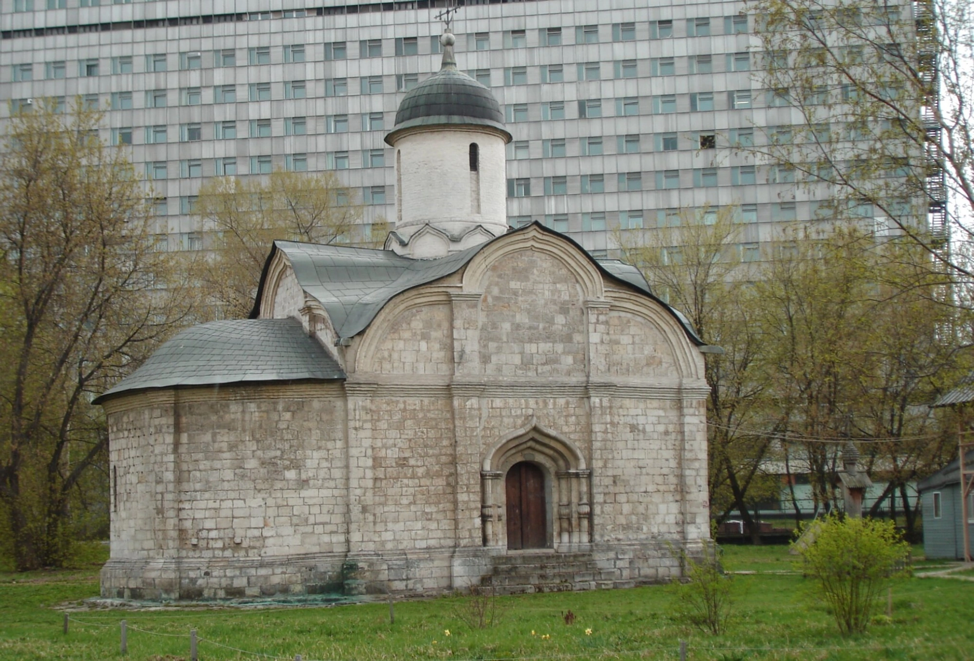 На представленной фотографии запечатлён древний православный храм во имя святого мученика Трифона, что расположен в бывшей Напрудной слободе Москвы. Этот белокаменный одноглавый храм является одним из древнейших сохранившихся церковных сооружений столицы, памятником архитектуры федерального значения.
