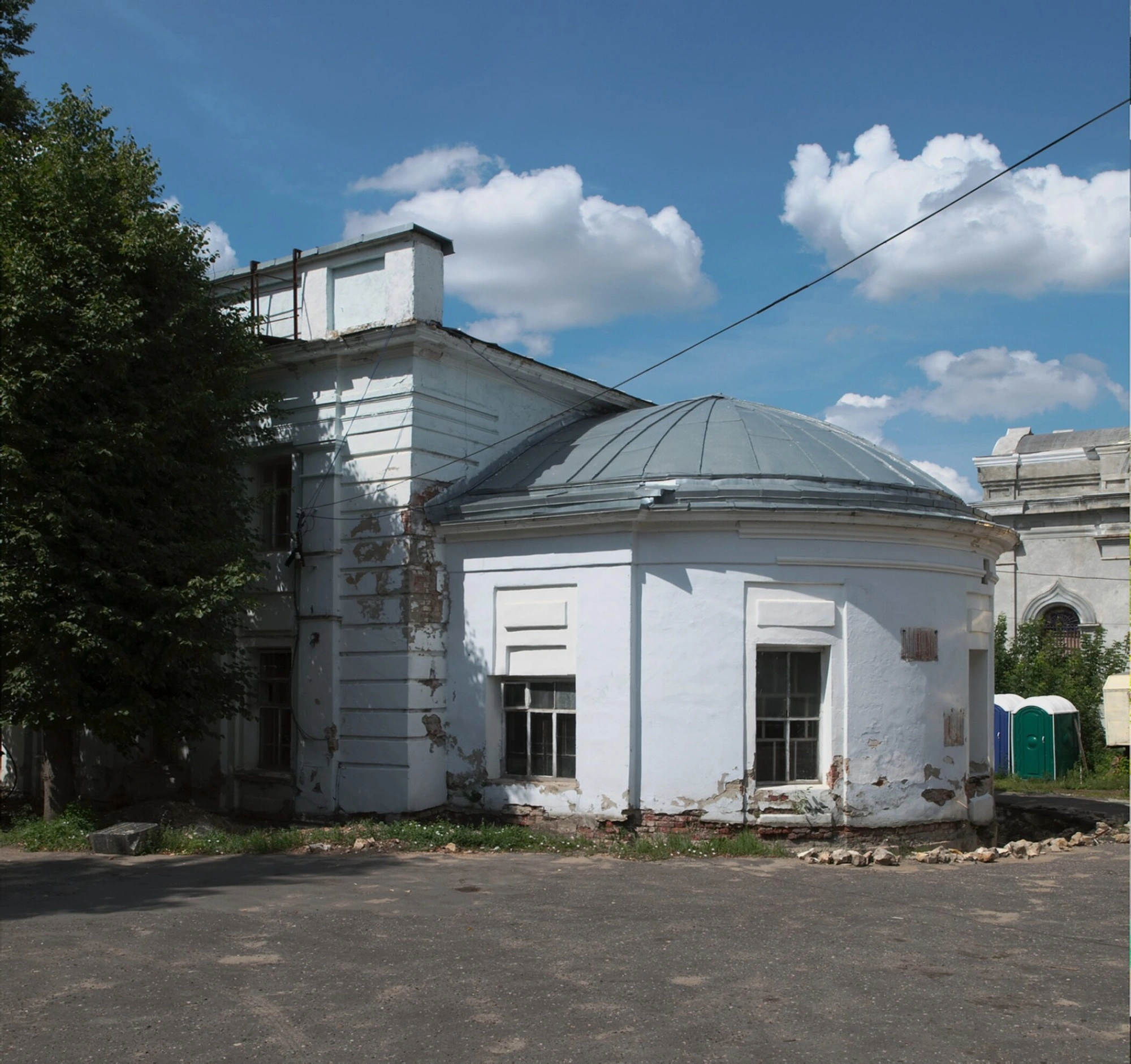 На снимке видна часть территории обители. Присутствие временных построек, таких как биотуалеты, указывает на ведущиеся на территории восстановительные и реставрационные работы, что вселяет надежду на полное возрождение этой святыни. Густое дерево слева и голубое небо с облаками создают мирный и спокойный пейзаж, подчёркивая особую, намоленную атмосферу этого места. Дорога перед храмом ведёт к его святым вратам, приглашая верующих на молитву.