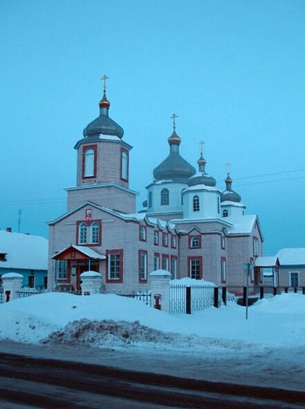 Снежный покров обильно укутал землю, кровли малых архитектурных форм и ограждение церковного двора, создавая атмосферу благоговейной тишины и умиротворения, присущую православным святыням. Чётко просматриваются архитектурные детали храма: арочные оконные проёмы, входная группа, колонны и традиционный для церковного зодчества декор.