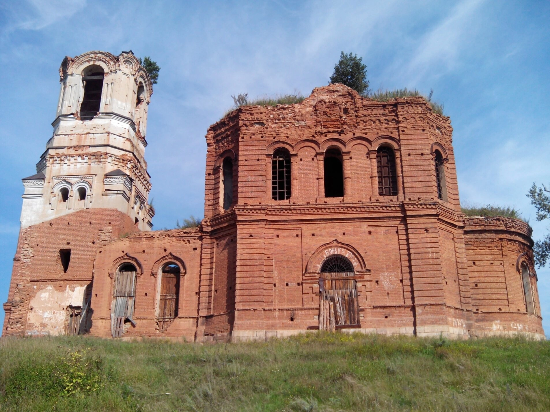 На представленной фотографии запечатлён храм во имя святителя Николая Чудотворца, расположенный в селе Исетское Свердловской области. Этот православный храм, ныне пребывающий в скорбном состоянии разрушения, является немым свидетелем истории и былого величия.