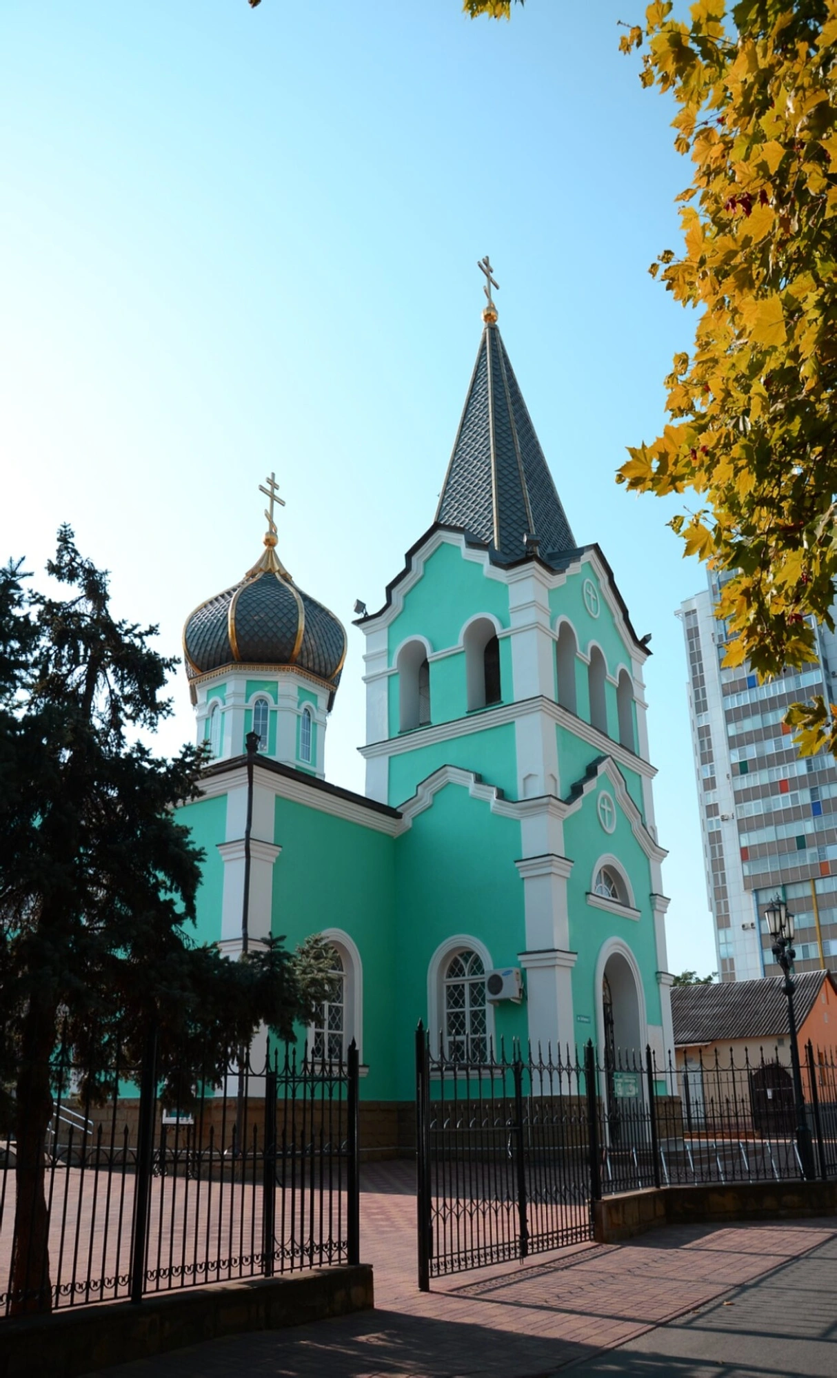 Здание храма, выполненное в светлых бирюзовых тонах, гармонично сочетается с лазурным южным небом. Чистые и лаконичные формы, увенчанные тёмными куполами и изящным шпилем колокольни, создают образ строгой и в то же время величественной церковной архитектуры. Белоснежные декоративные элементы и оконные наличники подчёркивают благолепие внешнего убранства.