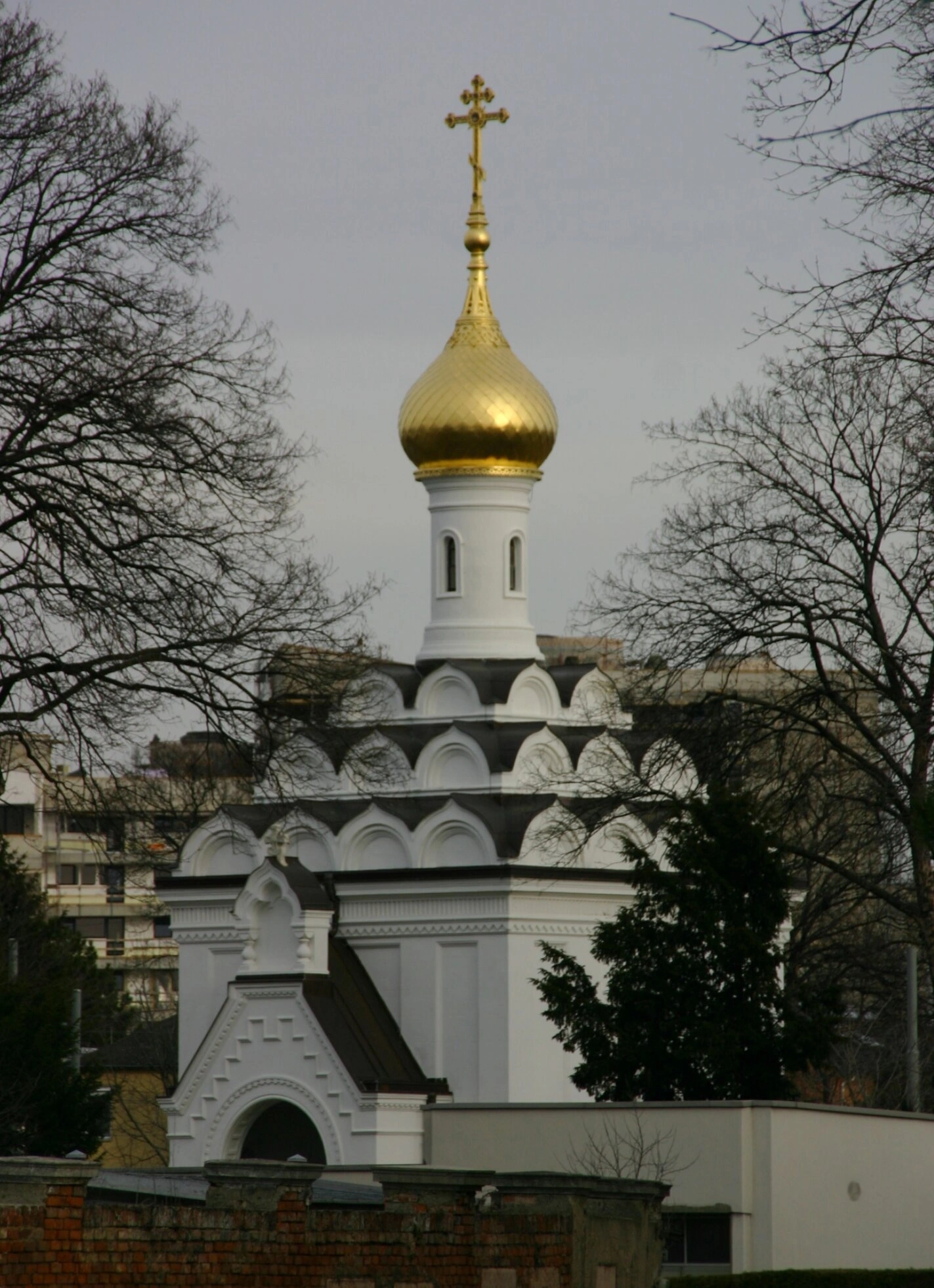 На представленной фотографии запечатлён храм во имя святого праведного Лазаря Четверодневного, находящийся на территории Центрального кладбища в Вене. Этот православный храм, относящийся к Венской и Австрийской епархии Русской Православной Церкви, является значимым духовным центром для русскоязычной паствы и местом упокоения многих выдающихся деятелей.
