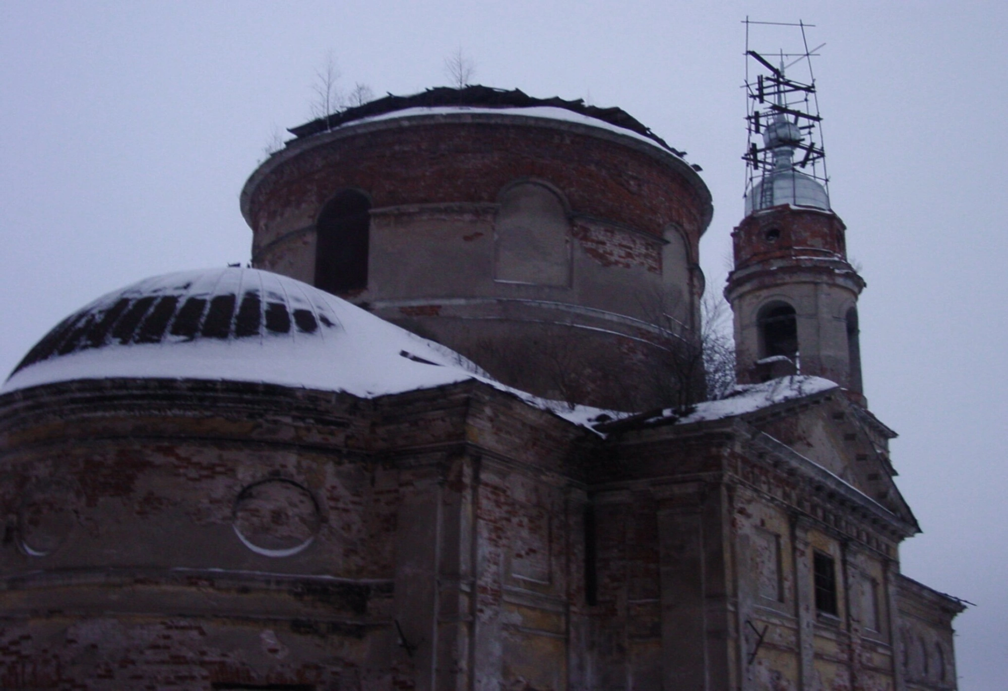 Здание храма, сложенное из красного кирпича, обладает характерной для православных церквей объёмно-пространственной композицией. На снимке видны главки, венчающие световые барабаны и частично укрытые снежным покровом, что свидетельствует о съёмке в зимний период. Присутствие строительных лесов на одной из башен указывает на проведение реставрационных работ, направленных на сохранение этого духовного и исторического памятника.