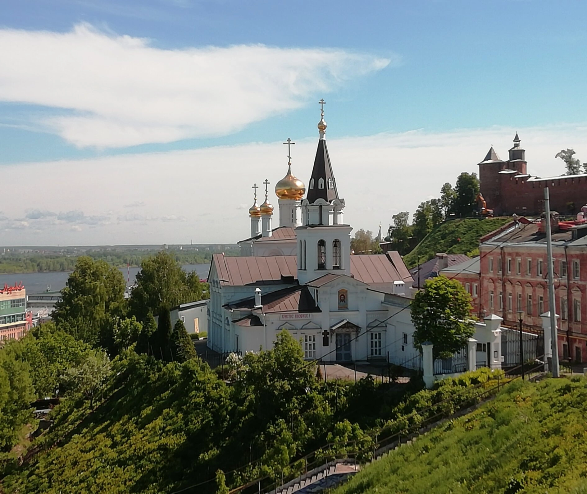 На представленной фотографии запечатлена белокаменная Церковь святого пророка Божия Илии, что располагается на Ильинской улице в историческом районе Започаинье Нижнего Новгорода. Храм, увенчанный пятью златыми куполами, возвышается на живописном зелёном холме, открывая взору благодатный вид на водную гладь вдали. С правой стороны от святой обители виднеются старинные здания, а на заднем плане, на возвышенности, высятся краснокирпичные стены древнего Нижегородского кремля — немого свидетеля многих событий в истории города. Небо над храмом ясное, озарённое мягким солнечным светом, что придаёт всему образу величие и духовный покой.