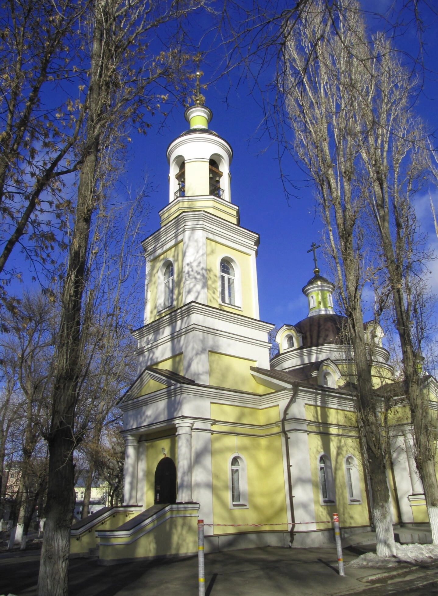 На представленной фотографии запечатлён вход в Храм святого пророка Божия Илии, расположенный на Ильинской площади в Саратове. Снимок сделан в зимнее или ранневесеннее время, о чём свидетельствуют голые деревья на переднем плане. Ярко-голубое небо с лёгкими облаками подчёркивает чистоту и величие церковного строения. Ракурс съёмки снизу вверх усиливает впечатление монументальности храма.