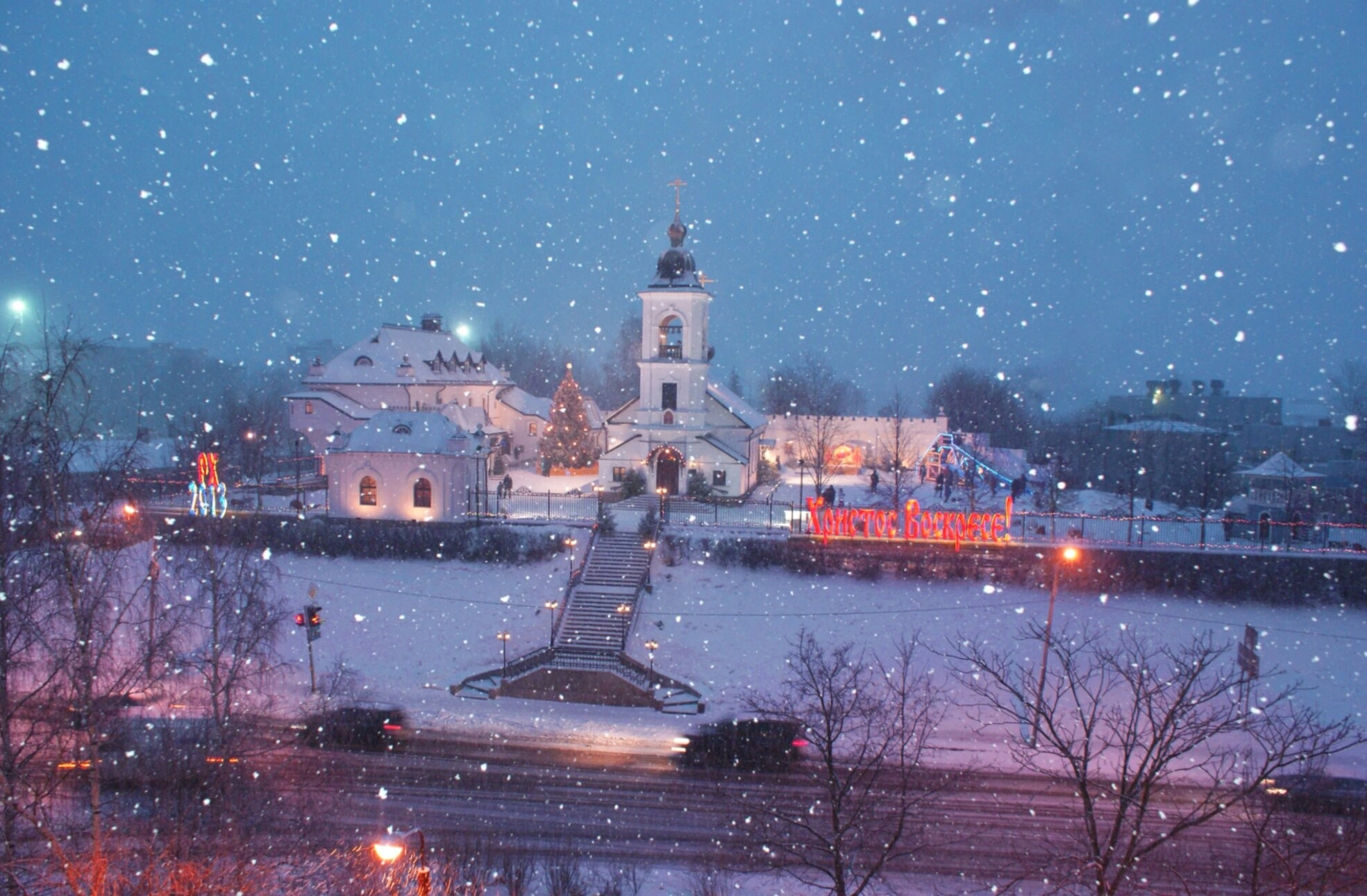 На переднем плане фотографии видна заснеженная дорога с движущимися автомобилями и светофором, что подчёркивает, что дом Божий находится в самом сердце живой городской жизни, призывая горожан к вечному. На заднем плане видны другие строения и деревья, также укрытые снегом, что создаёт умиротворённый и спокойный пейзаж.