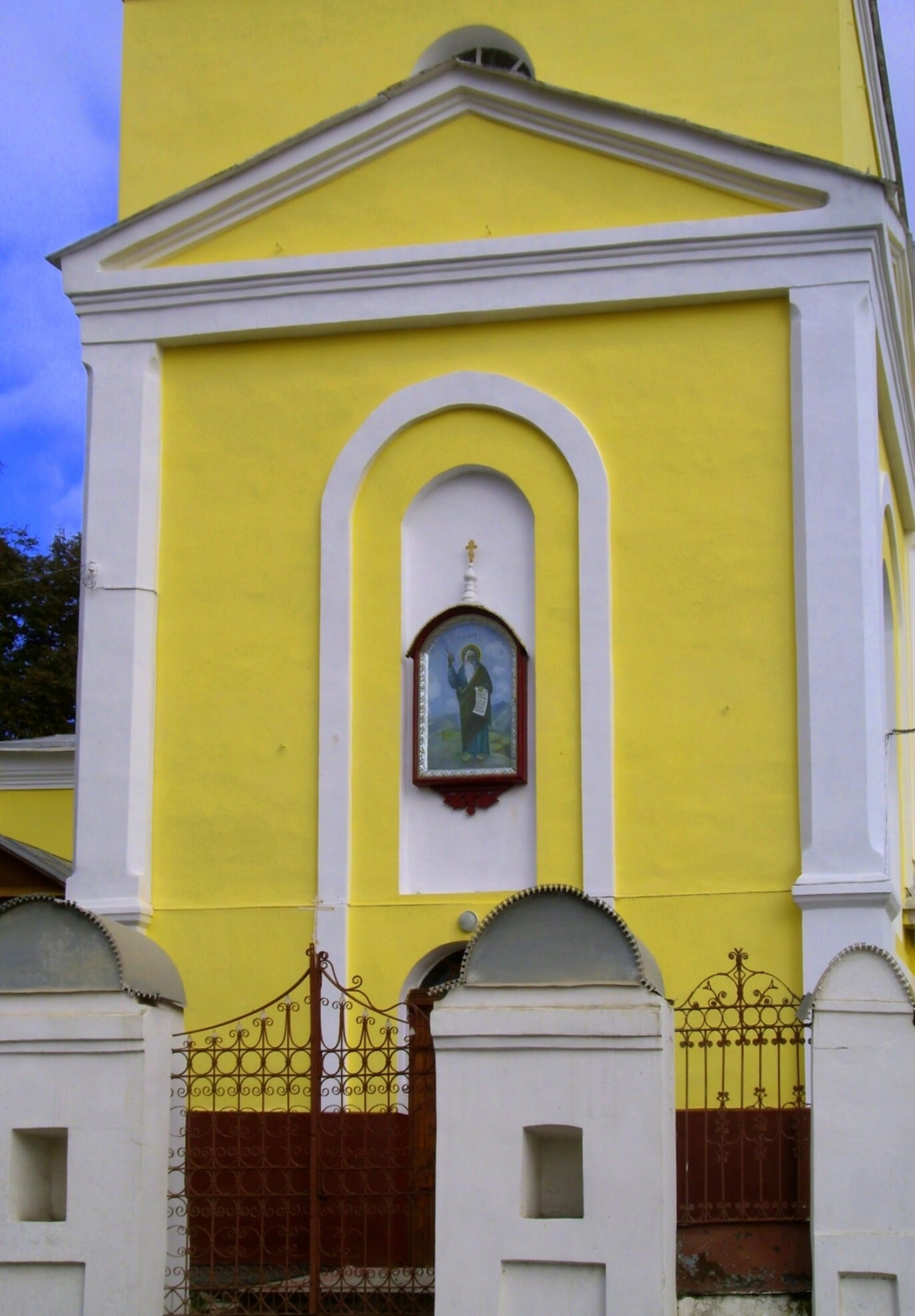 Основной объём здания окрашен в тёплый жёлтый цвет, который символизирует свет веры и благодати. Архитектурную выразительность фасаду придают белоснежные элементы: строгие пилястры, профилированные карнизы и изящное обрамление центральной арочной ниши. Такое цветовое решение создаёт ощущение торжественности и величия.