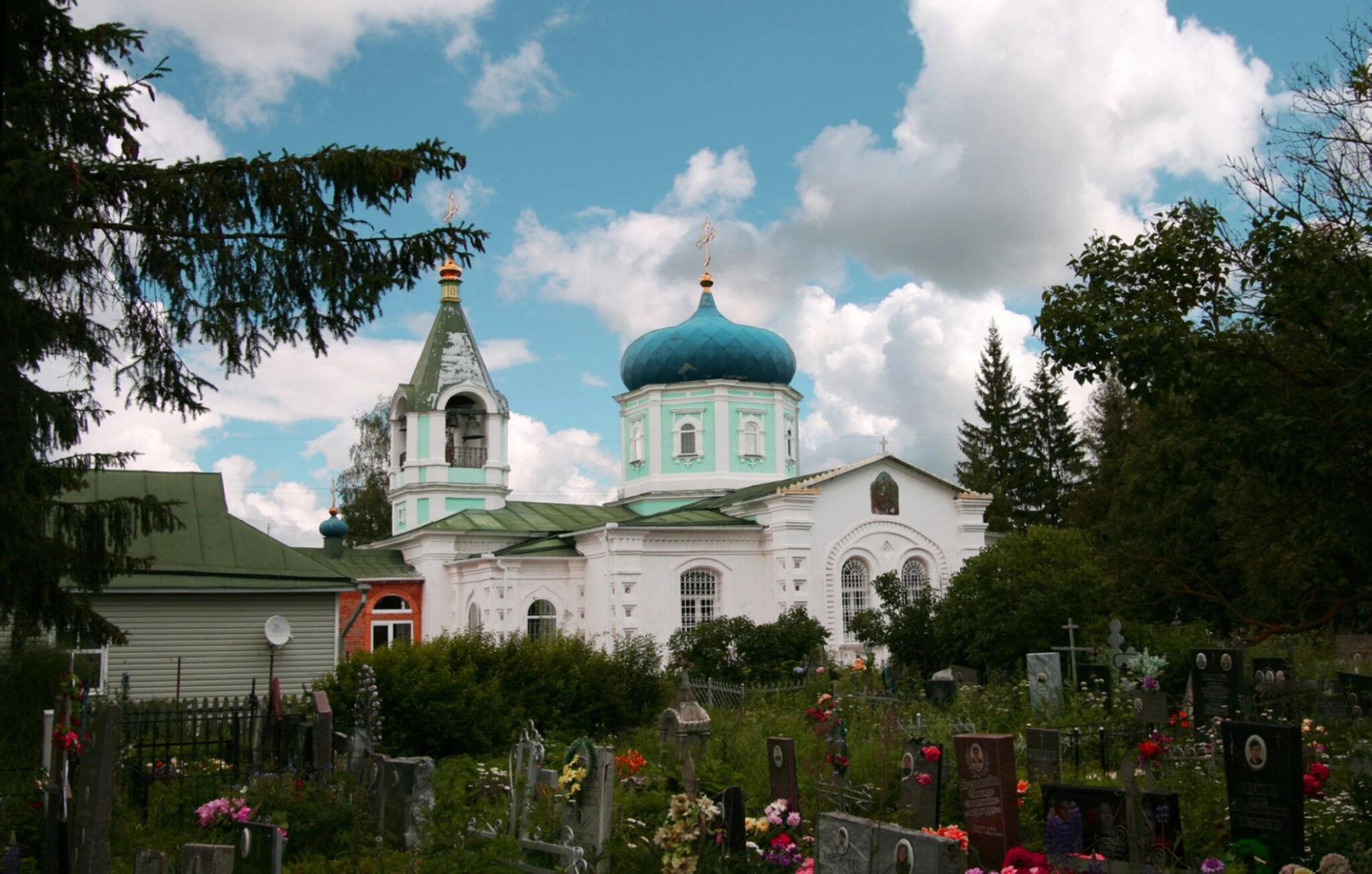 Храмовой комплекс окружён благоухающей зеленью деревьев и кустарников, создающей особую молитвенную атмосферу уединения и покоя. На переднем плане фотографии видна благоустроенная территория церковного кладбища с ухоженными надгробиями и свежими цветами, свидетельствующими о памяти и заботе прихожан об упокоении усопших.