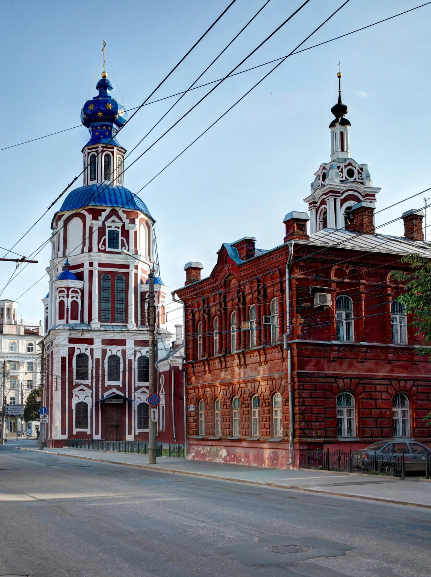 Храмовой комплекс демонстрирует характерную для русского церковного зодчества архитектуру. Основной объём выполнен из красного кирпича с изящными белыми декоративными элементами и оконными наличниками, что создаёт торжественный и нарядный облик. Центральный синий купол, увенчанный золочёным крестом и усыпанный звёздами, символизирует небесную славу и устремлённость к Богу. Рядом с главным храмом расположено здание церковной постройки из схожего материала, также украшенное небольшой башней со шпилем и крестом, что предполагает его использование для приходских нужд.