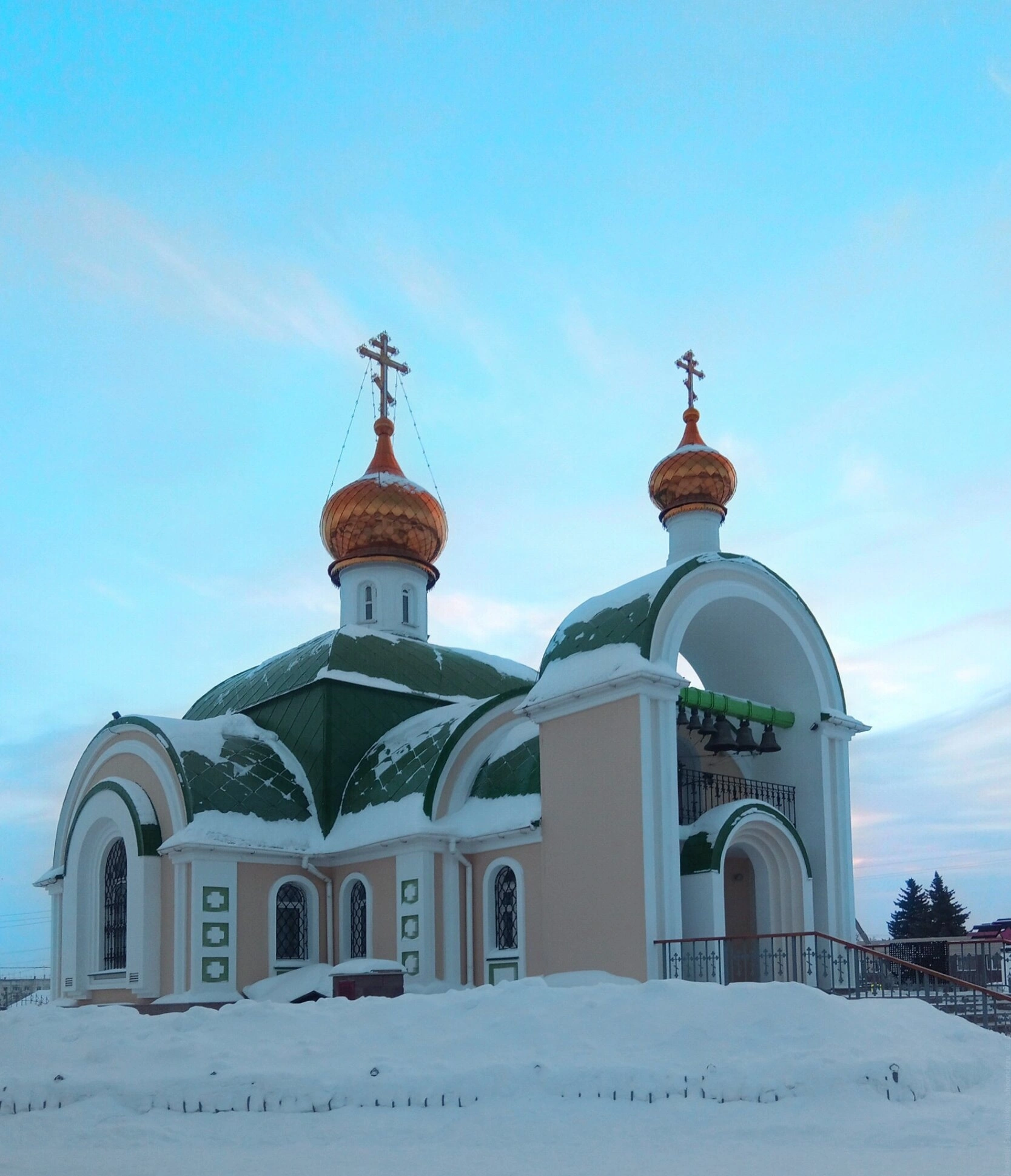 На фотографии запечатлён храм в честь Святого Равноапостольного Князя Владимира, расположенный в Челябинске. Святыня предстаёт в тихом величии зимнего дня, укрытая чистым снегом. Архитектурный облик храма традиционен для русского православного зодчества. Основной объём венчают два золочёных купола, над которыми возвышаются православные кресты, сияющие в холодном зимнем воздухе. К западному фасаду храма примыкает арочная звонница, увенчанная собственной главкой, что создаёт гармоничный и завершённый силуэт.