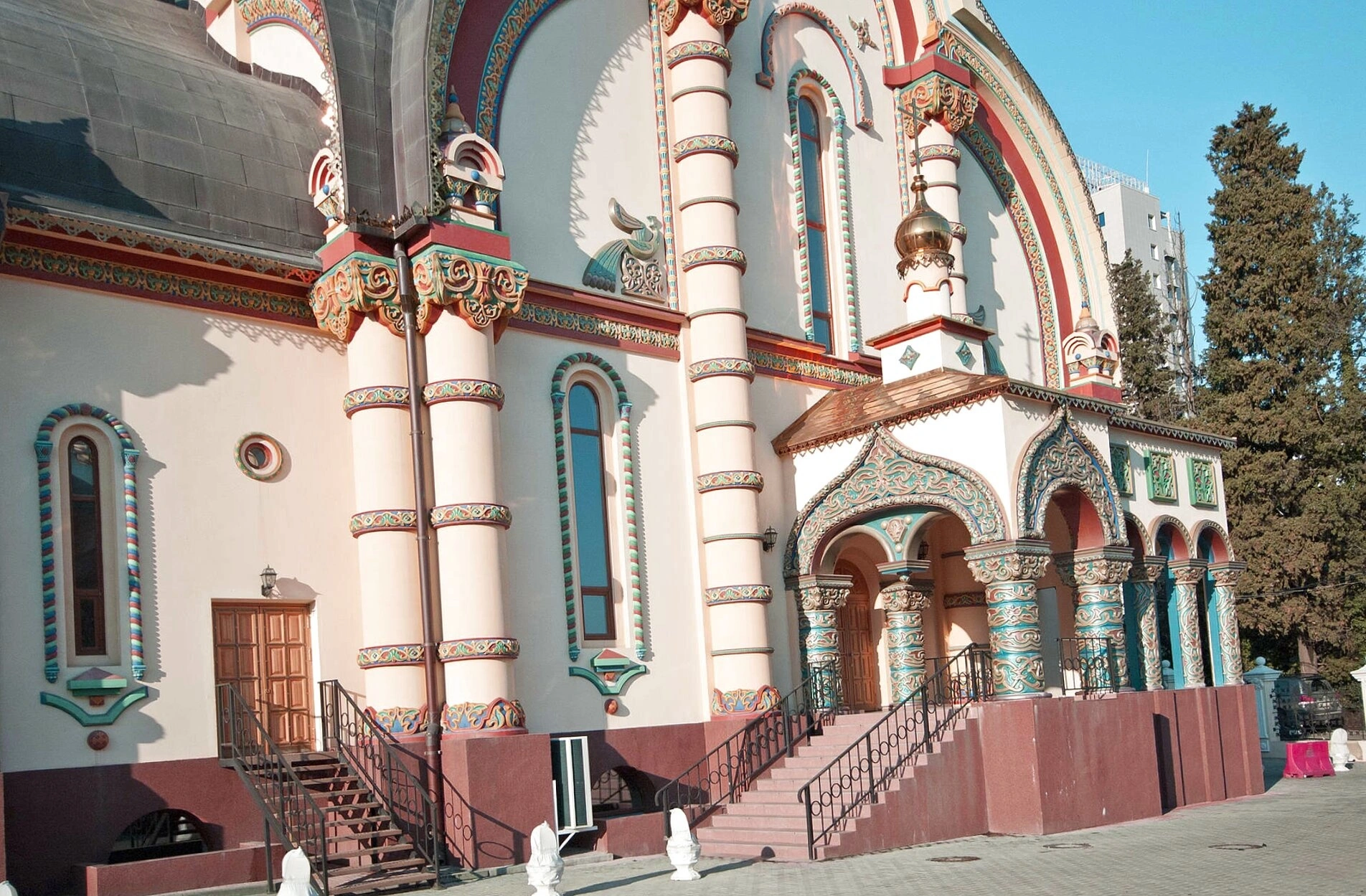 Над одним из входов возвышается изящная главка, увенчанная позолоченной маковкой с крестом, сияющим под лучами южного солнца. Этот купол, являющийся символом небесного свода, свидетельствует о православном предназначении сооружения. На заднем плане угадываются очертания других куполов храма, создающих завершённый сакральный образ.