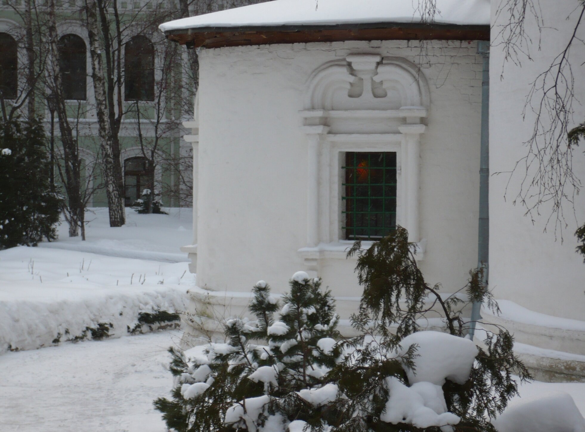 На фотографии видна часть белокаменного здания храма, характерная для русской церковной архитектуры. Чистота линий и сдержанный декор фасада отражают традиции монастырского зодчества. Окно, украшенное скромным резным наличником, обрамлено снегом, что создает ощущение умиротворения и тепла, исходящего изнутри, из самого сердца обители.