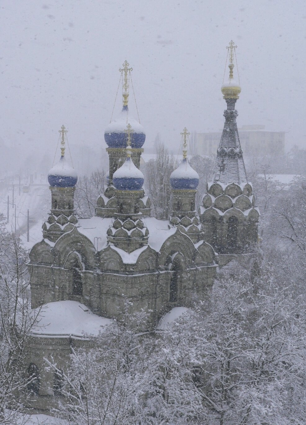 На фотографии запечатлена Русская православная церковь во имя преподобного Симеона Дивногорца, находящаяся в самом сердце Саксонии, в городе Дрездене. Святыня, окормляющая православную паству немецкой земли, предстаёт в дивном зимнем убранстве. Обильный снегопад окутал белоснежным покровом её кровли и знаменитые синие купола, увенчанные златыми крестами, устремлёнными в небеса. Снежные шапки легли на ветви деревьев на переднем плане, оттеняя величие церковной архитектуры.