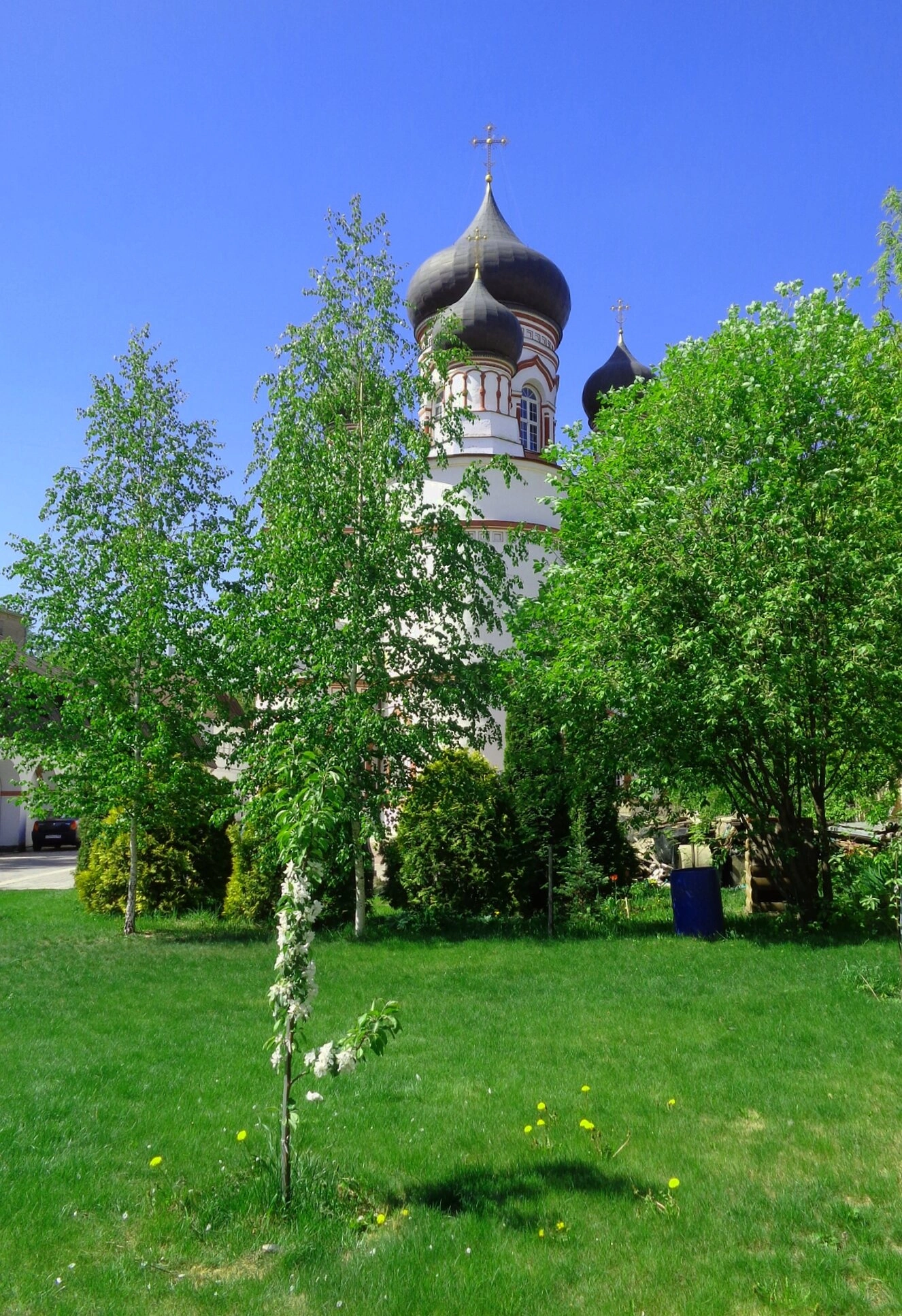 На фотографии запечатлён храм святого великомученика Димитрия Солунского, расположенный в историческом районе Москвы Благуше. Святыня, увенчанная благолепными чёрными куполами, символизирующими монашеское смирение и устремлённость к Небесному, мирно покоится в окружении благоухающей зелени. На переднем плане виднеется цветущее дерево, что придаёт кадру особую жизнерадостность и светлое настроение, напоминая о вечном обновлении и красоте Божьего мира.