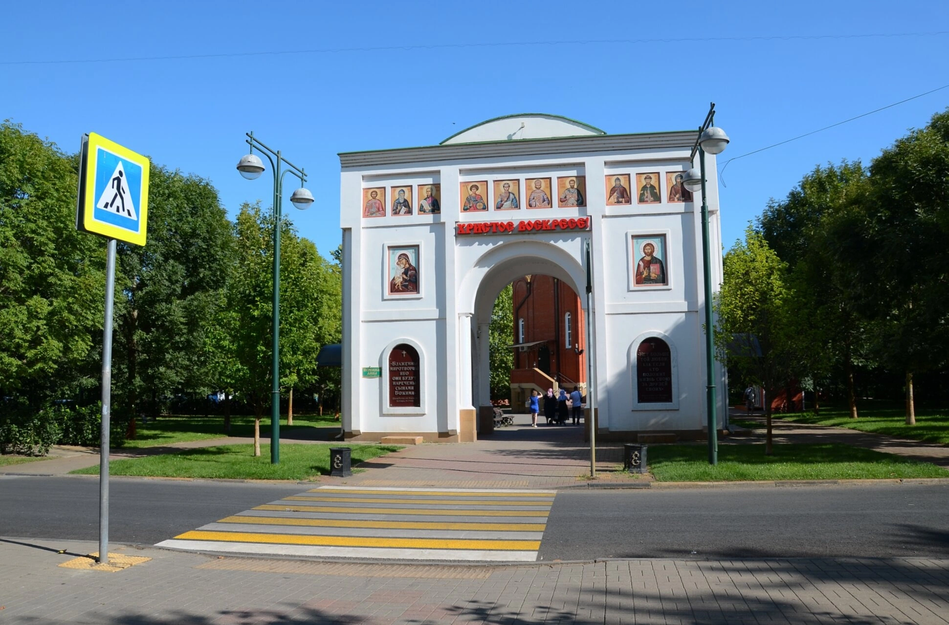 Перед аркой обустроен пешеходный переход, обеспечивающий безопасный путь для паломников и прихожан. Указатель пешеходного перехода, расположенный слева на переднем плане, подчёркивает заботу о благоустройстве территории. Через эту арку верующие попадают в духовный оазис, где возносится непрестанная молитва.