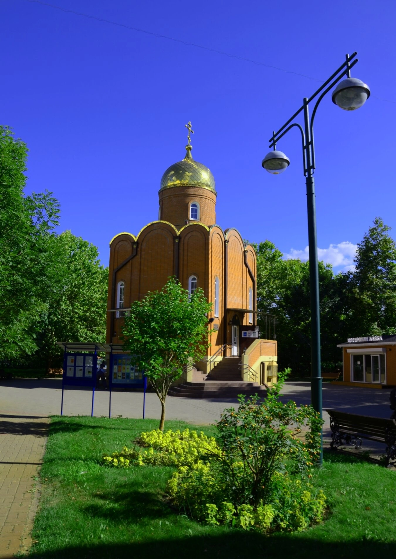 На переднем плане фотографии справа можно видеть уличный фонарь с двумя светильниками, а слева — пышные желтые цветущие кусты, добавляющие яркий акцент в композицию снимка. Чистое голубое небо над храмом наполняет изображение светом и воздухом, создавая настроение мира и духовной радости. Этот храм является не только архитектурной доминантой, но и важным центром духовной жизни православных христиан Краснодара, посвящённым одному из самых почитаемых святых — великомученику Димитрию Солунскому, небесному покровителю воинов и защитников.
