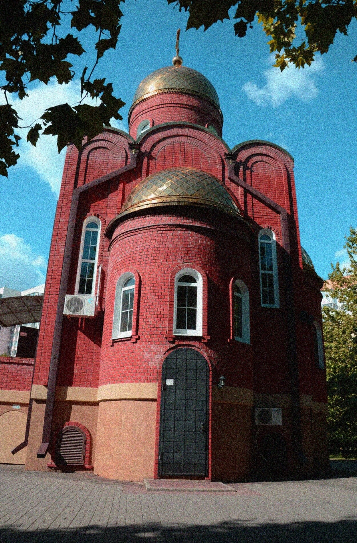 На фотографии запечатлён храм в честь святого великомученика Димитрия Солунского, расположенный в городе Краснодаре. Святыня, возведённая из красного кирпича, представляет собой прекрасный образец современной церковной архитектуры, выполненной в русских традициях. Главный золотой купол, венчающий храм, символизирует Христа как главу Церкви и сияет под южным солнцем, призывая верующих к молитве.