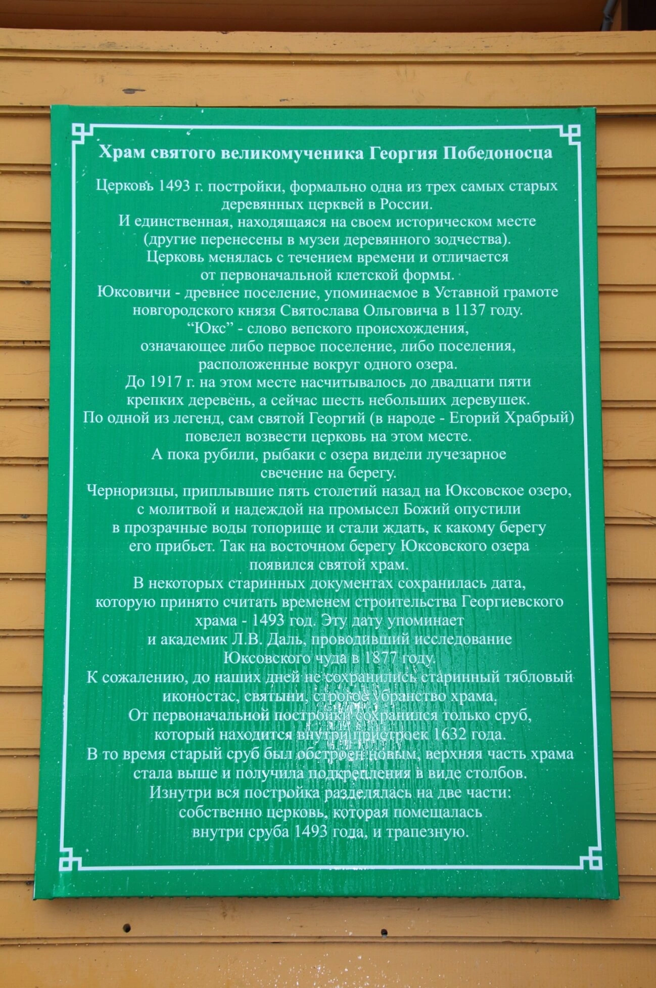 Согласно приведенной информации, церковь была возведена в 1493 году и принадлежит к числу трех древнейших деревянных храмов, сохранившихся на территории России. Особую ценность представляет тот факт, что данный храм является единственным из них, сохранившим свое первоначальное местоположение. Благочестивое предание гласит, что сам святой великомученик Георгий указал место для строительства этого храма.