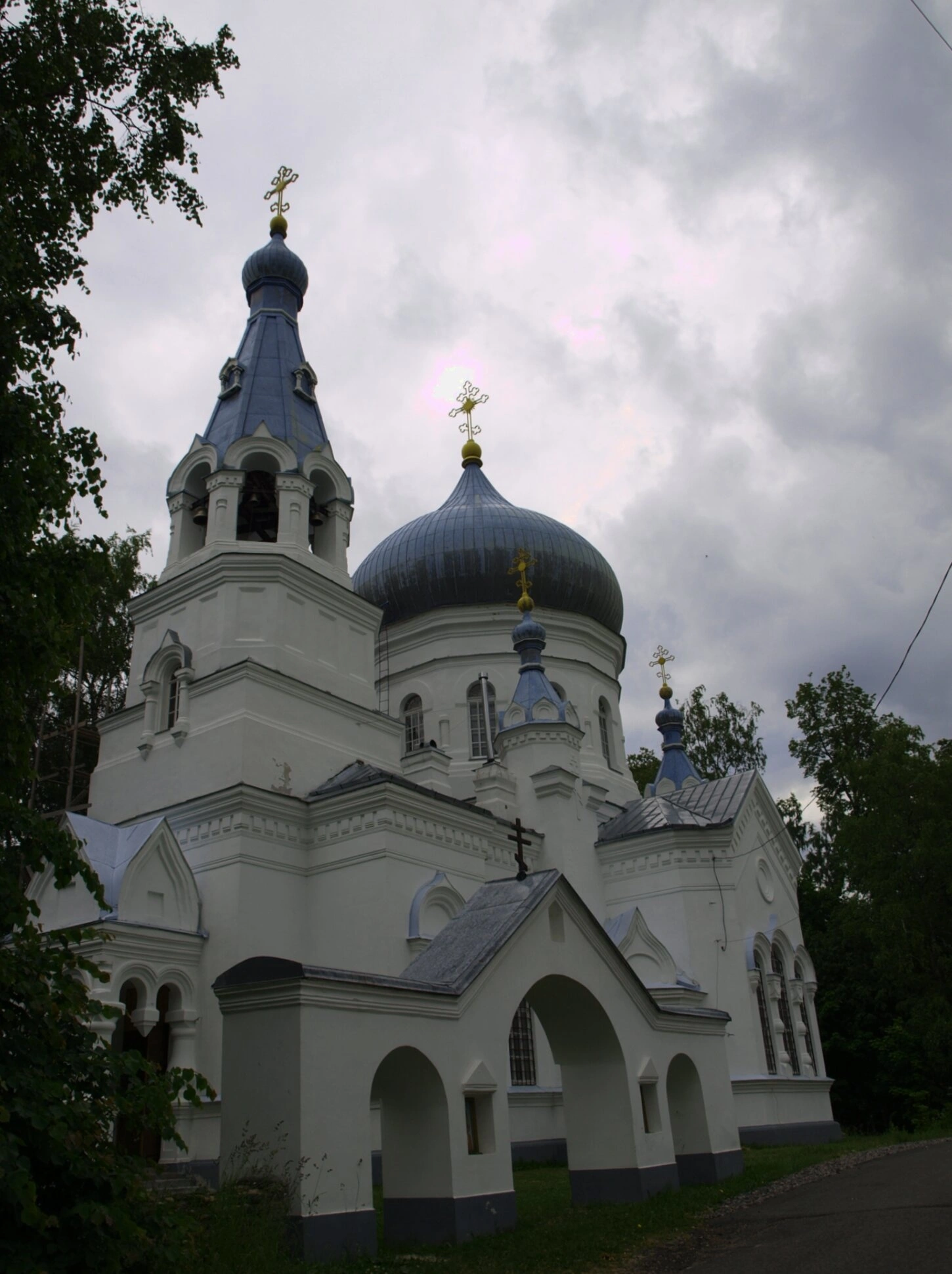 Белоснежный храм, увенчанный синими куполами, символизирующими небесную чистоту, гармонично сочетается с зеленью окружающих его деревьев и высоким облачным небом. Центральный объём церкви завершается массивным световым барабаном с луковичной главой, над которой сияет православный крест. Над западным притвором горделиво возвышается шатровая колокольня, также увенчанная главкой и крестом, а её ярус звона некогда оглашал округу благодатным колокольным звоном. Четыре малые главки, завершающие композицию, придают храму особую завершённость и устремлённость ввысь.