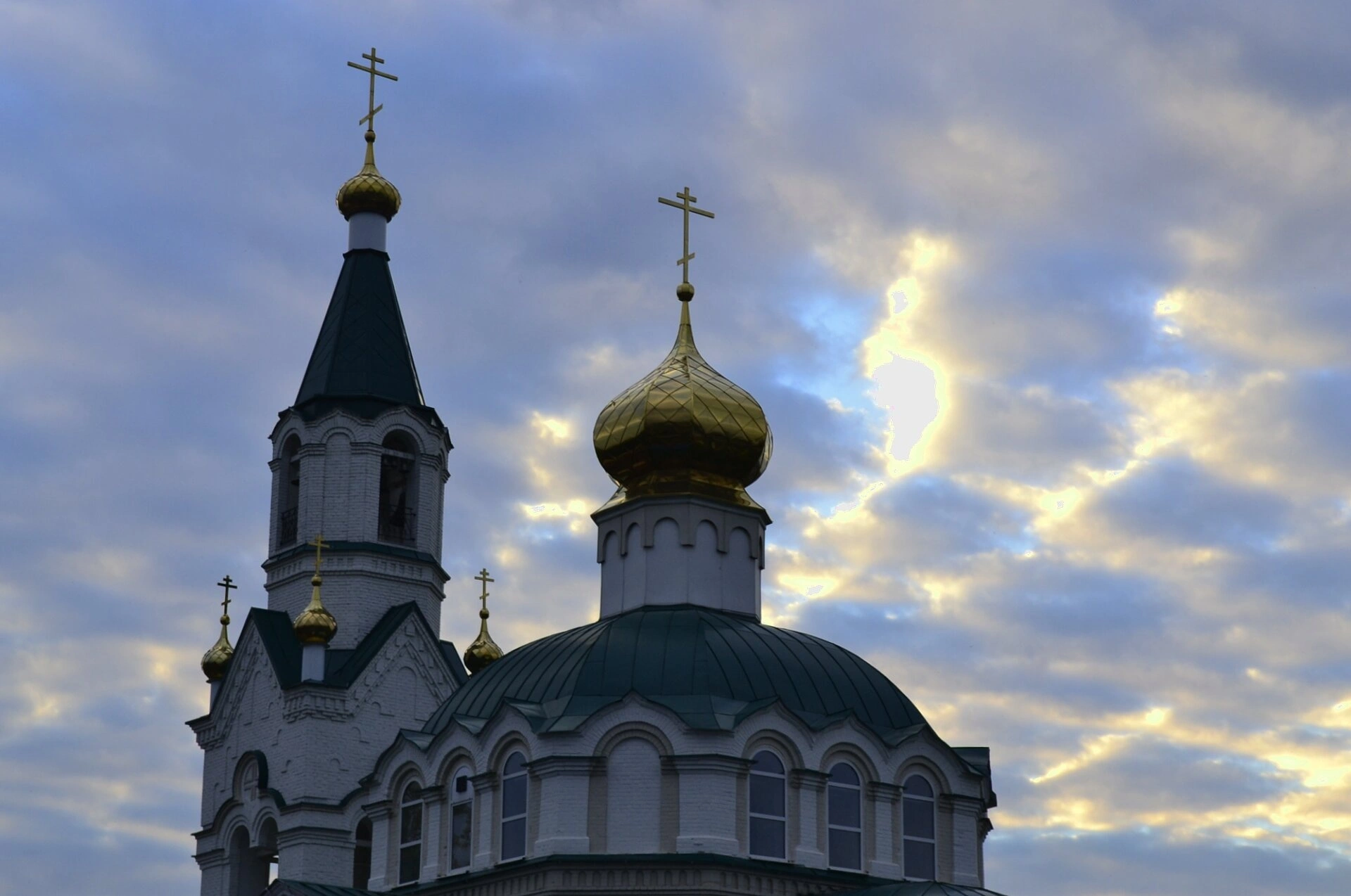 На переднем плане фотографии сияют позлащённые главы храма, над которыми возносятся честные кресты — символы спасения и искупительной жертвы Христовой. Ближний купол, имеющий округлую сферическую форму, традиционно символизирует небесный свод, в то время как вытянутый купол колокольни, устремлённый ввысь, знаменует собой молитву и горение духа к Богу. Ярко-зелёное покрытие кровли гармонично сочетается с золотом глав, создавая жизнеaffirmative и радостное цветовое решение.