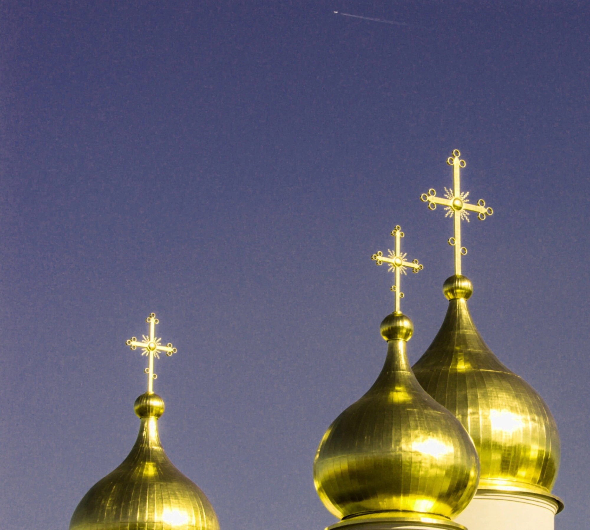 На представленной фотографии запечатлены сияющие на солнце золотые купола и вознесённые к небу кресты православного храма. Это собор Святой Равноапостольной Марии Магдалины, являющийся кафедральным собором Мадридской епархии Русской Православной Церкви и духовным центром для православных верующих в Испании.