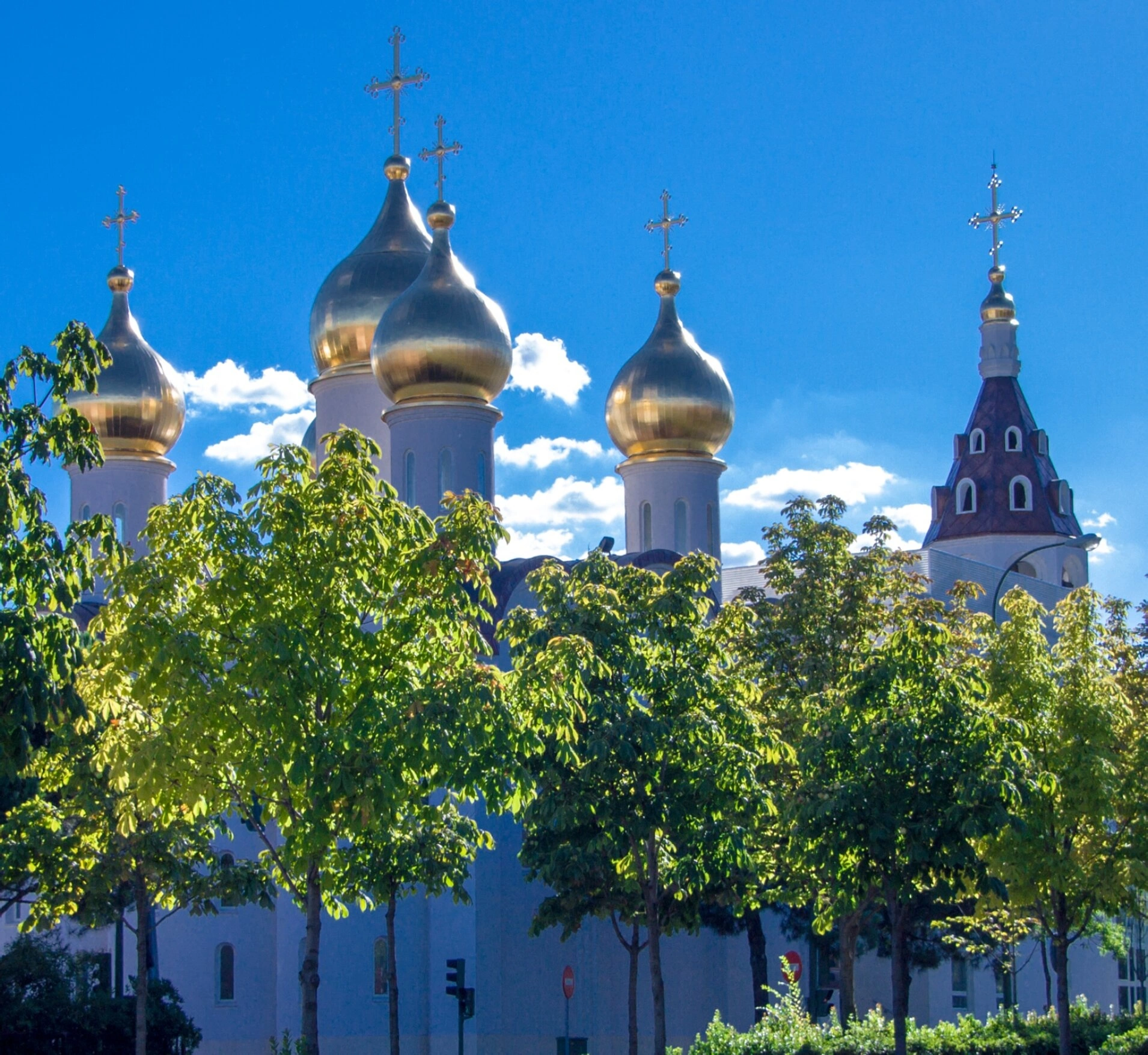 На фотографии запечатлён величественный русский православный храм во имя святой равноапостольной Марии Магдалины, расположенный в столице Испании. Святыня является духовным центром для православных верующих Мадрида и одной из архитектурных доминант города.