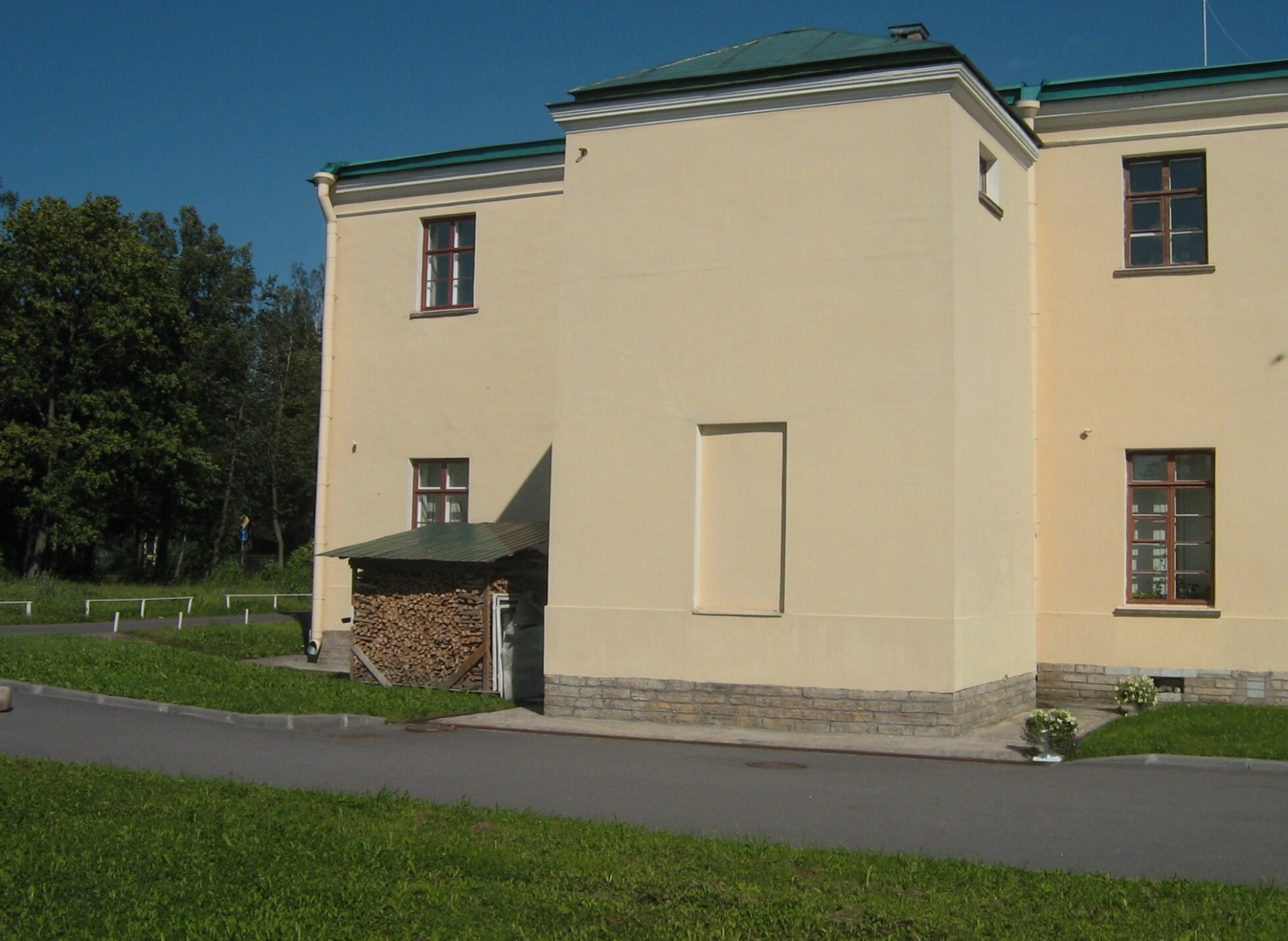 На представленной фотографии запечатлено одно из зданий, относящихся к церковному комплексу храма Святой равноапостольной Марии Магдалины в городе Павловске. Архитектурный ансамбль располагается по координатам 59.68500000 северной широты и 30.44638889 восточной долготы.