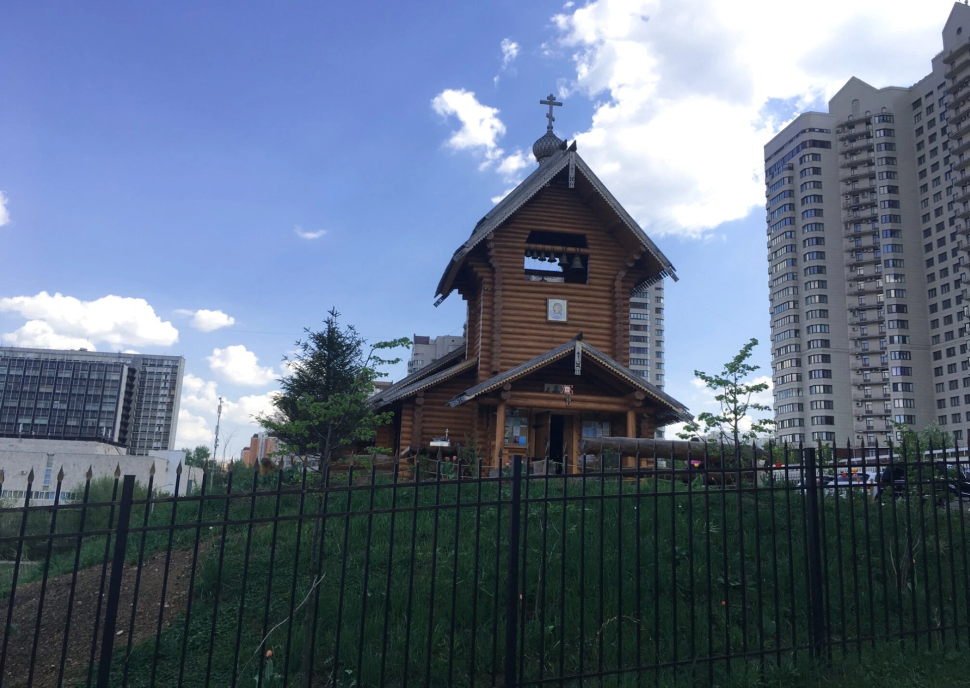 На заднем плане фотографии видны современные многоэтажные жилые дома, что создаёт выразительный контраст между вечной духовной традицией, воплощённой в храме, и динамичной городской средой. Этот визуальный диалог подчёркивает особую роль православной церкви в современном мегаполисе — быть духовным центром, местом молитвенного уединения и тишины среди городской суеты.
